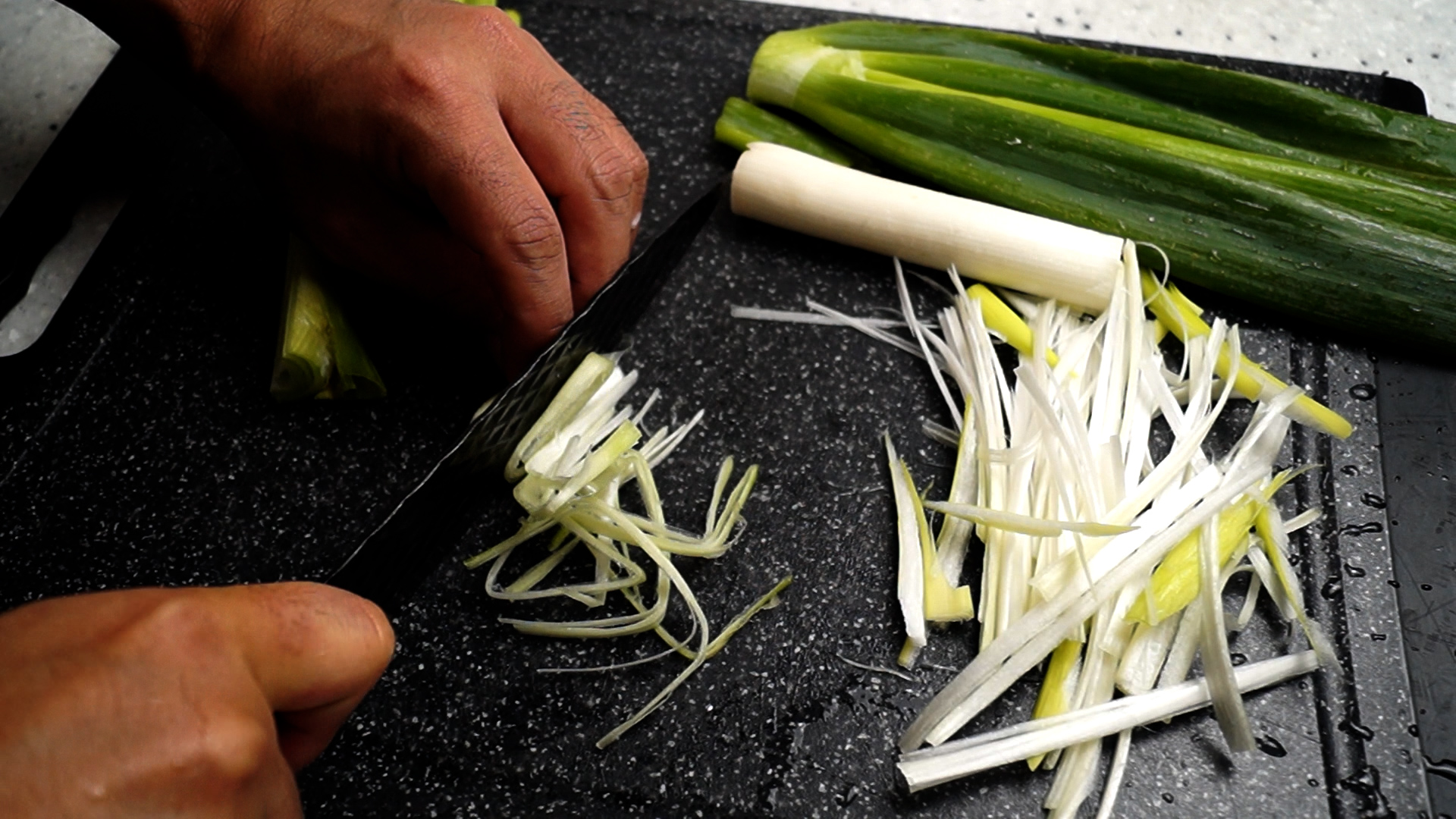 1. 대파 중간거 2대 분량을 길쭉길쭉 채를 썰어주세요. 칼로 썰어도 되고 파채칼 활용하셔도 되는데 더 편하게 드시려면 마트에서 채썬 대파를 구입하시면 정말 편합니다.