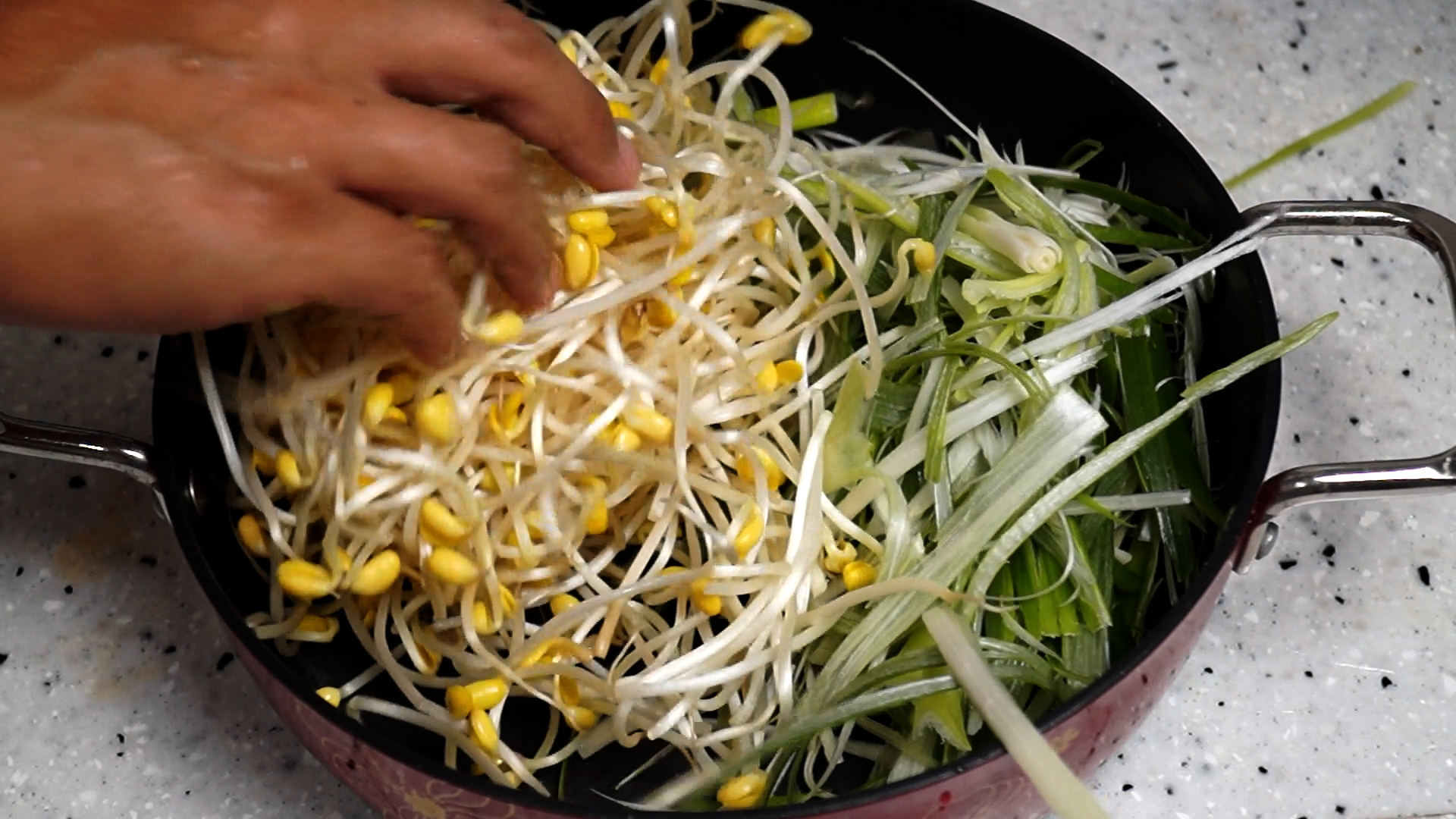2. 웍이나 전골 냄비에 채썬 대파와 세척한 콩나물을 넣어주세요.