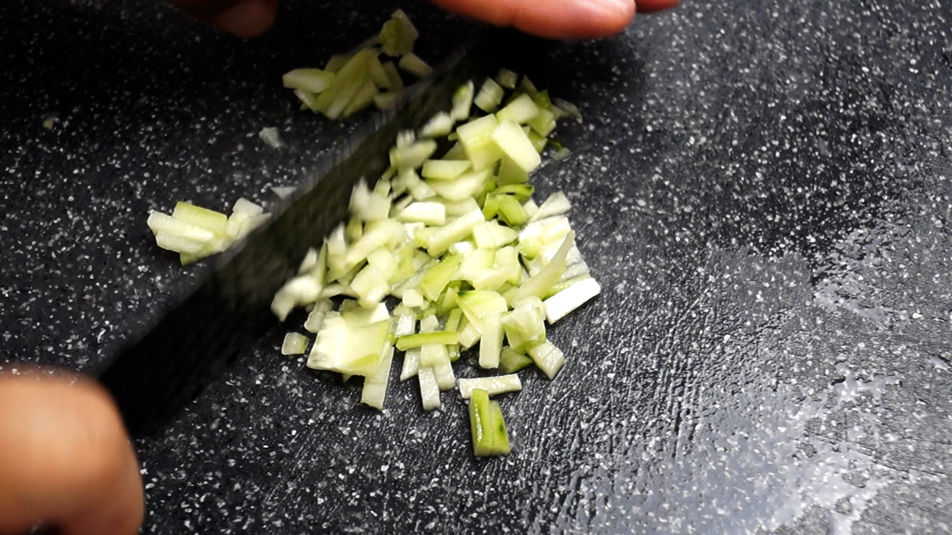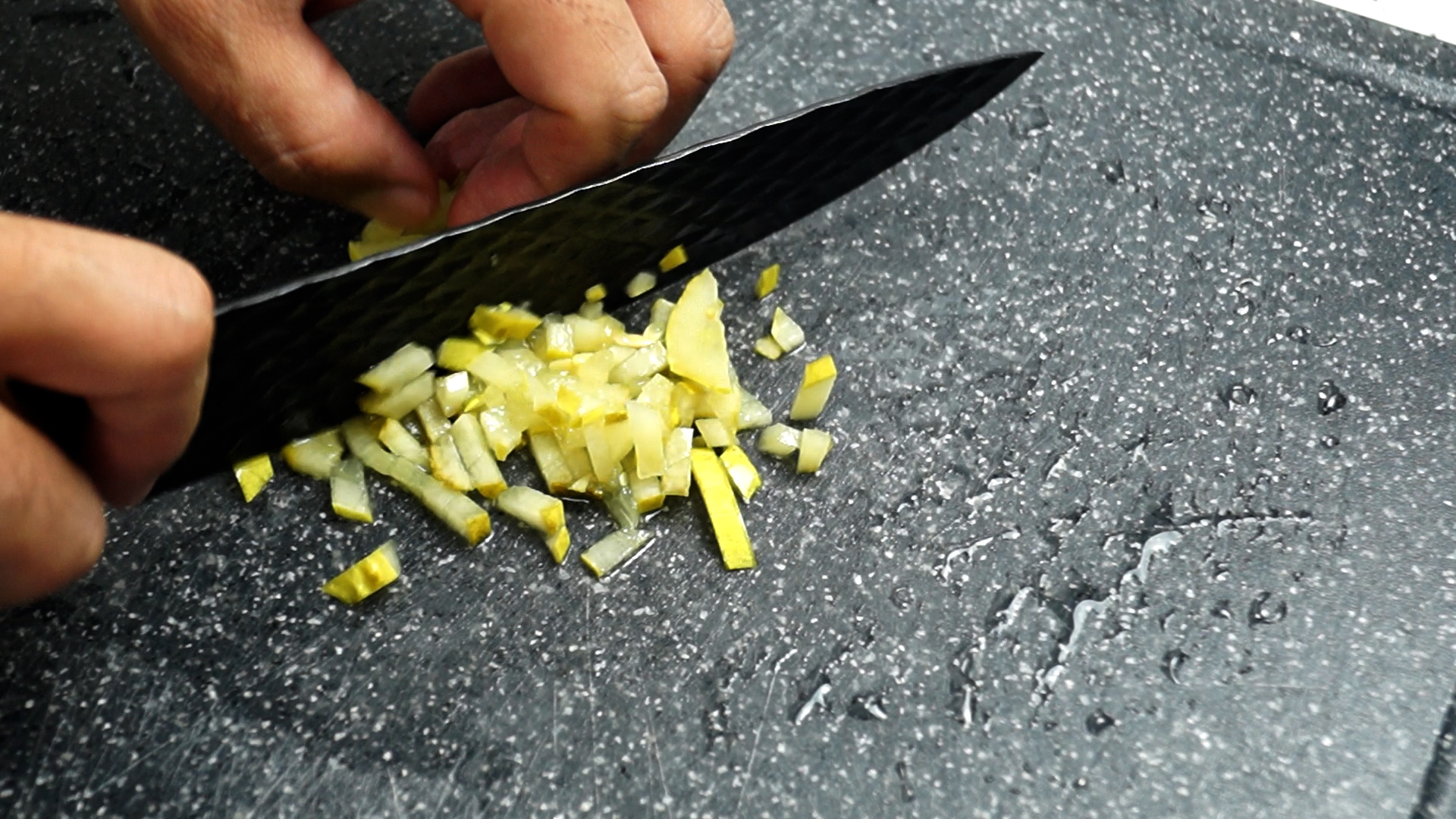 3. 피클 50g 을 잘게 다져주세요. 피클은 피자시켜먹고 남은 피클 활용하셔도 좋고 피클이 없을땐 단무지를 대신 활용해도 맛있습니다.