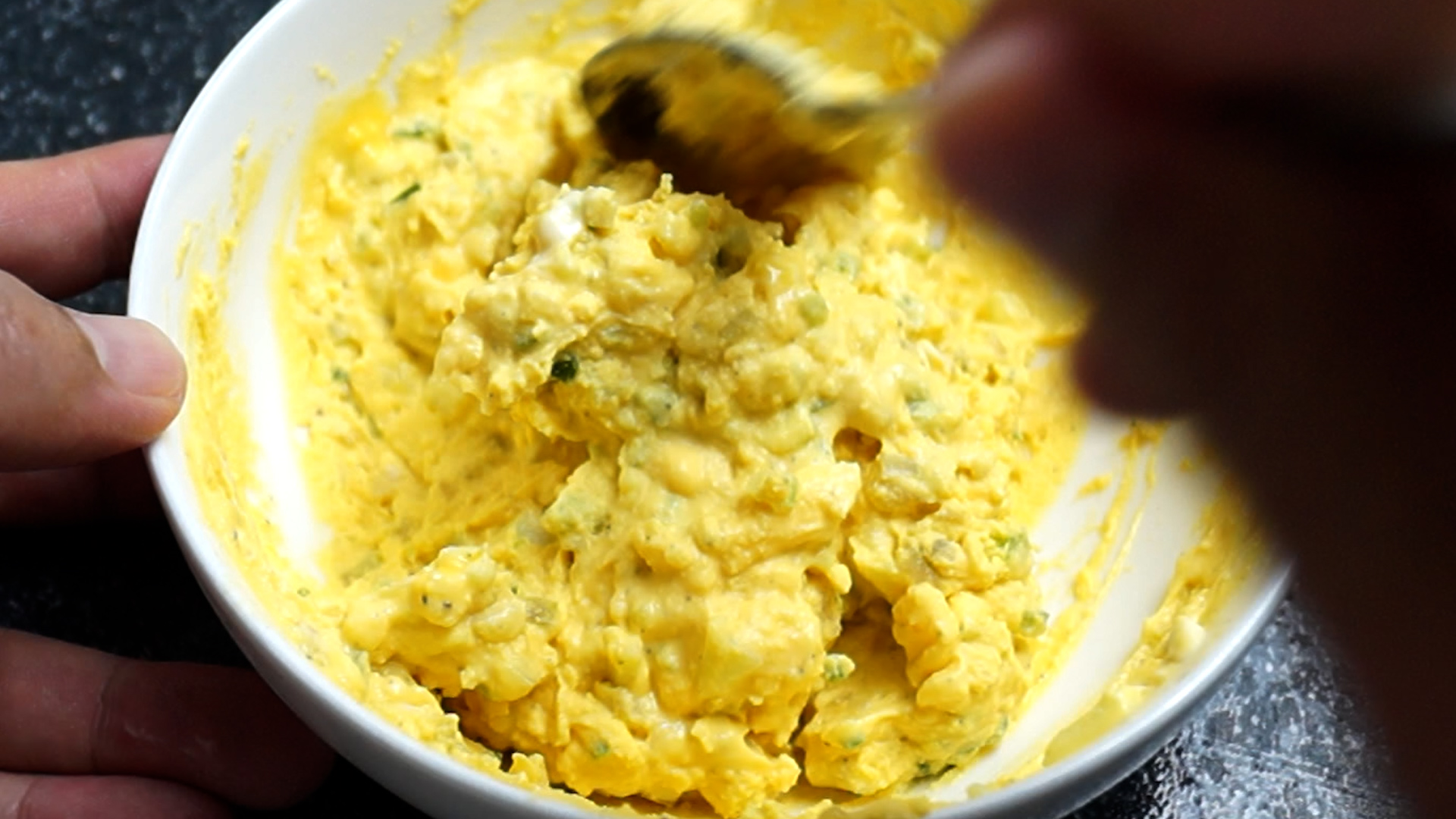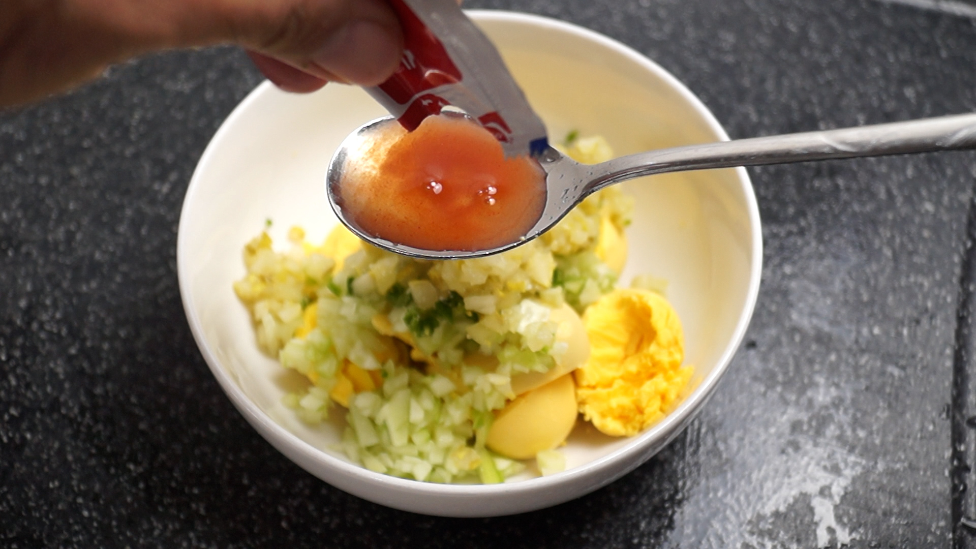 9. 핫소스를 넣어서 퍽퍽한 노른자에 새콤 매콤한 맛을 보태면서 수분감을 더해주세요.