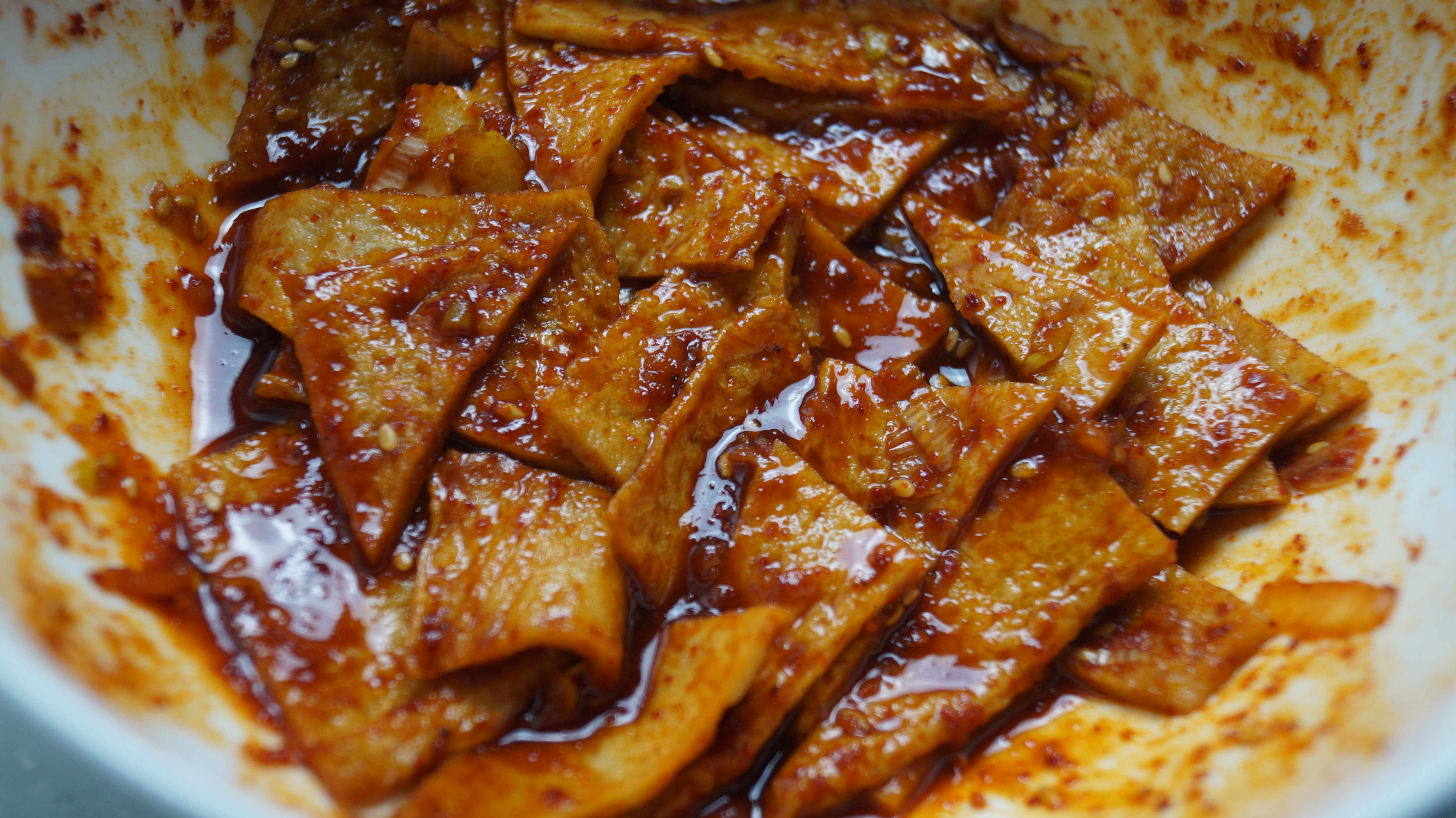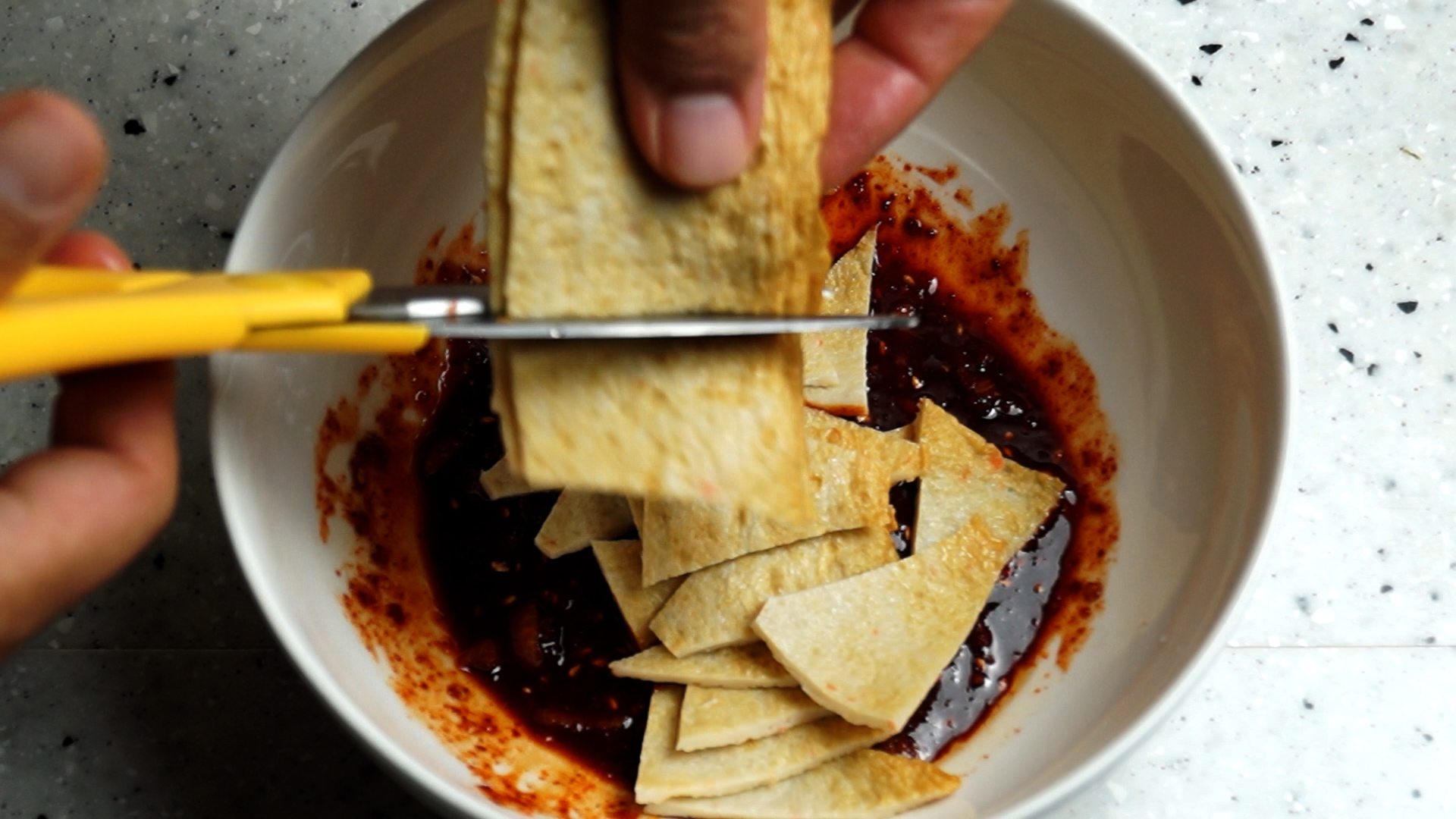 4. 손을 깨끗히 씻고 어묵을 양념에 넣어주세요.
