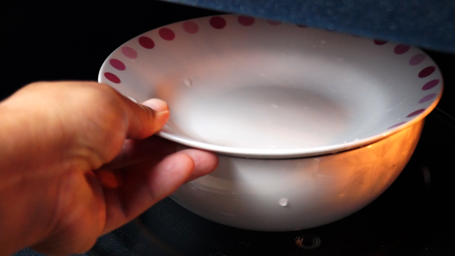 6. 전자렌지에 그릇을 넣고 그 위를 접시 같은 걸로 덮어서 1분을 돌려 주세요.