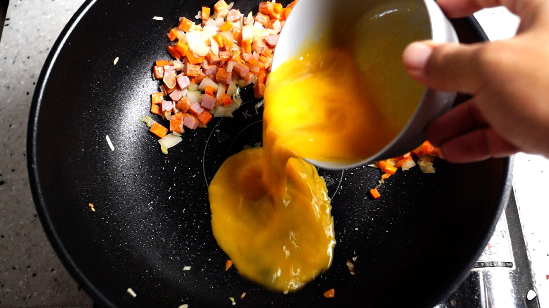 8. 양파가 살짝 투명해 질때 재료들은 한데 밀어 놓고 팬을 살짝 기울여 빈 공간에 계란물을 부어주시고 기울인 상태로 계란물이 재료에 가지 않게 스크램블로 볶아주세요. 원래 계란 이랑 재료 다 따로 볶는건데 설거지 거리 줄이려고 약식으로 했답니다~ 그래도 엄청 맛있어요!