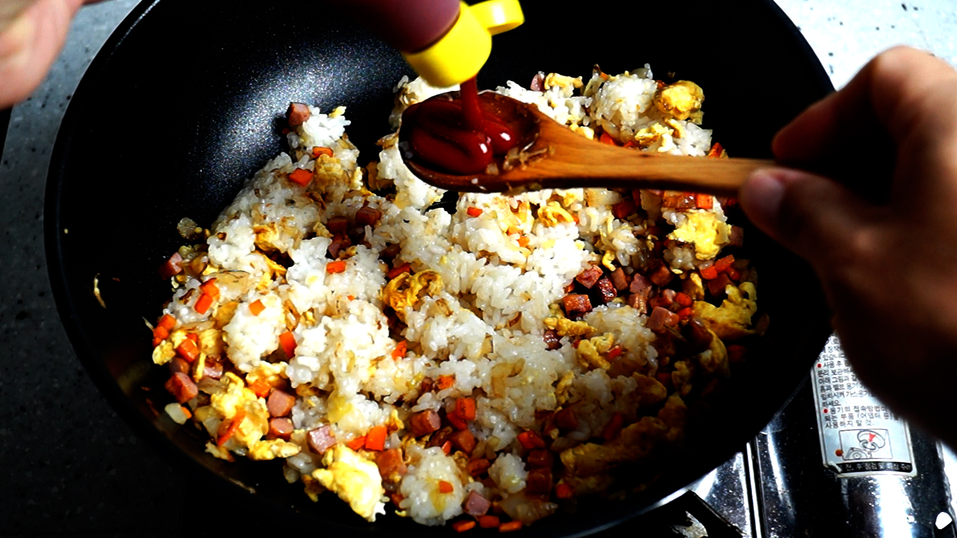 고슬고슬 볶아서 소금간만 해서 먹어도 맛있지만 제가 어릴적엔 어머니들이 계란볶음밥 만들때 케찹을 쇽~ 뿌려서 같이 볶아내는 집이 많았어요!