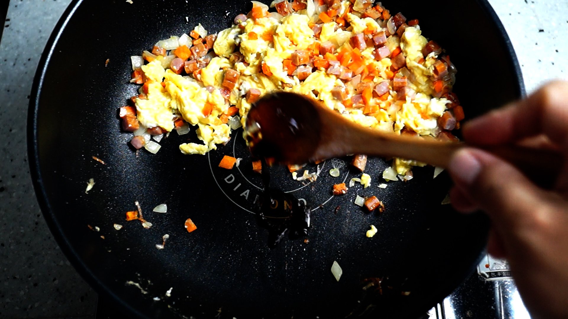9. 계란이 적당히 익었으면 계란과 재료를 골고루 섞어 준 다음 재료를 한군데 밀고 팬의 빈공간에 진간장을 부어 살짝 태우듯 볶아 간장풍미를 살려주세요.