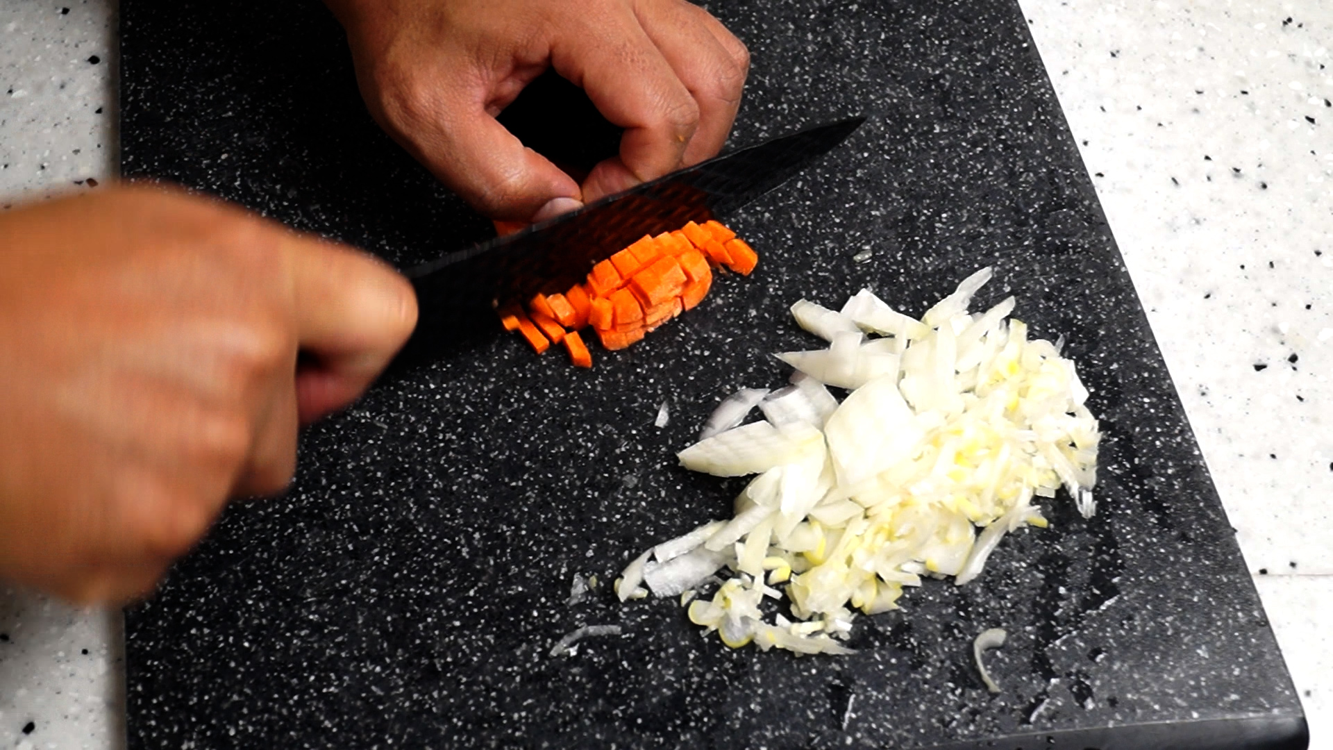 3. 당근은 0.5cm 이하로 깍둑 썰어서 대략 2~3큰술 나올 양을 썰어주세요.