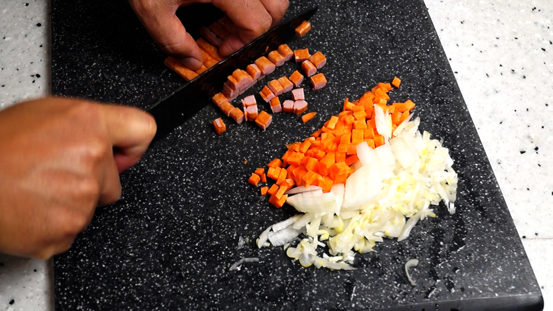 2. 양파는 0.5cm 정도로 썰어주세요. 요즘이야 볶음밥에 양파넣으면 하수란 말 하는 사람있지만 옛날 볶음밥엔 양파넣는집 많았어요~ 요즘도 중국집 볶음밥에 많이는 아니지만 양파가 소량 들어간 집들도 있답니다.