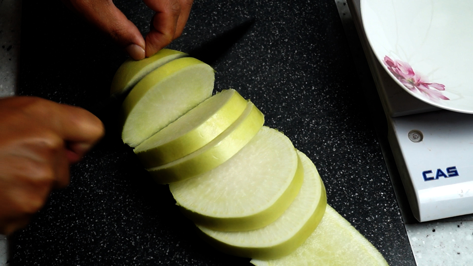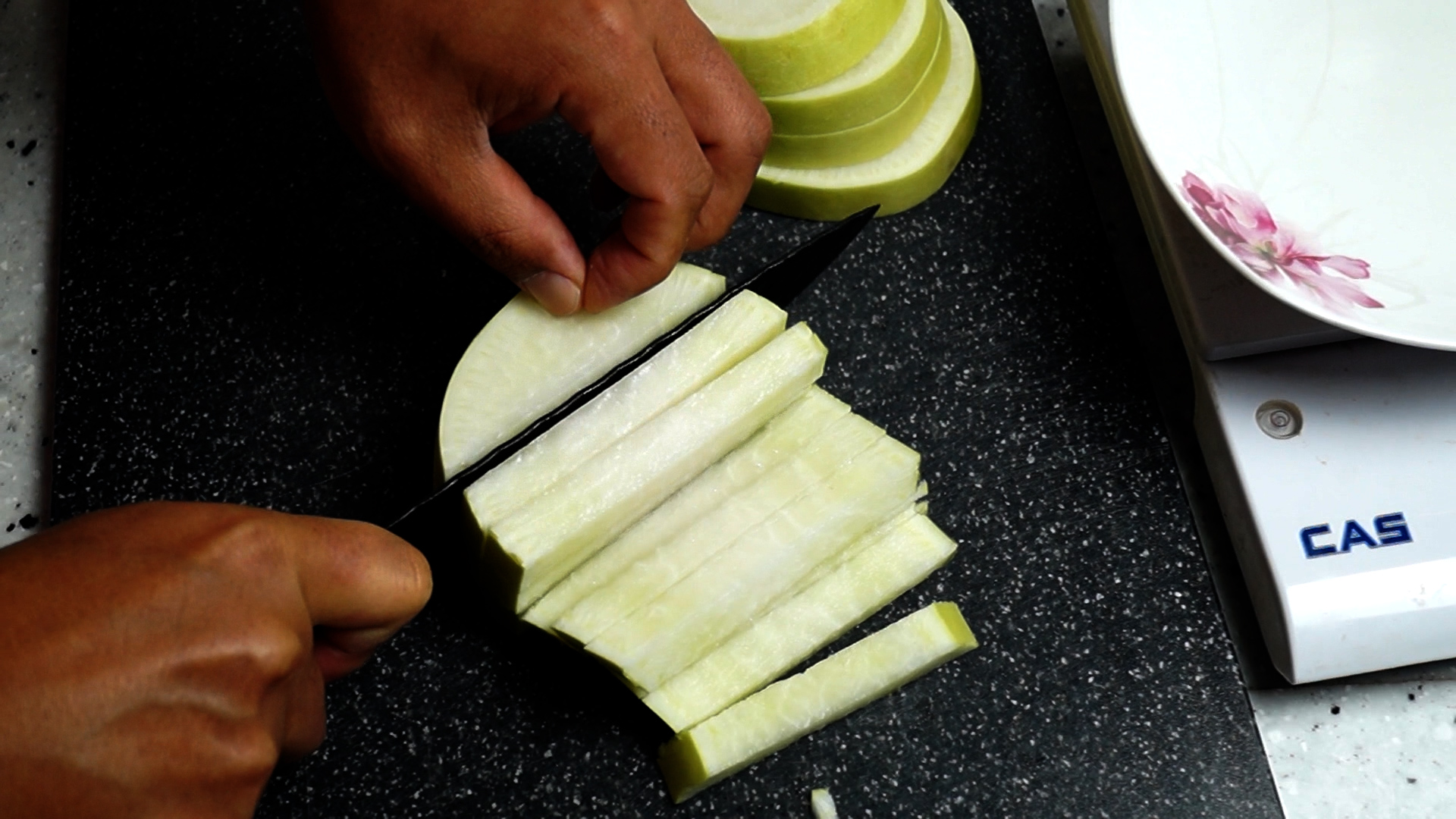 1. 무우를 새끼 손가락 2마디 정도로 3조각 을 준비하면 대략 750~800g 정도 됩니다. 하지만 무우 두께가 제각각이고 사람손가락 길이도 제각각이니^^.. 제일 좋은건 저울에 달아서 준비하는거에요~