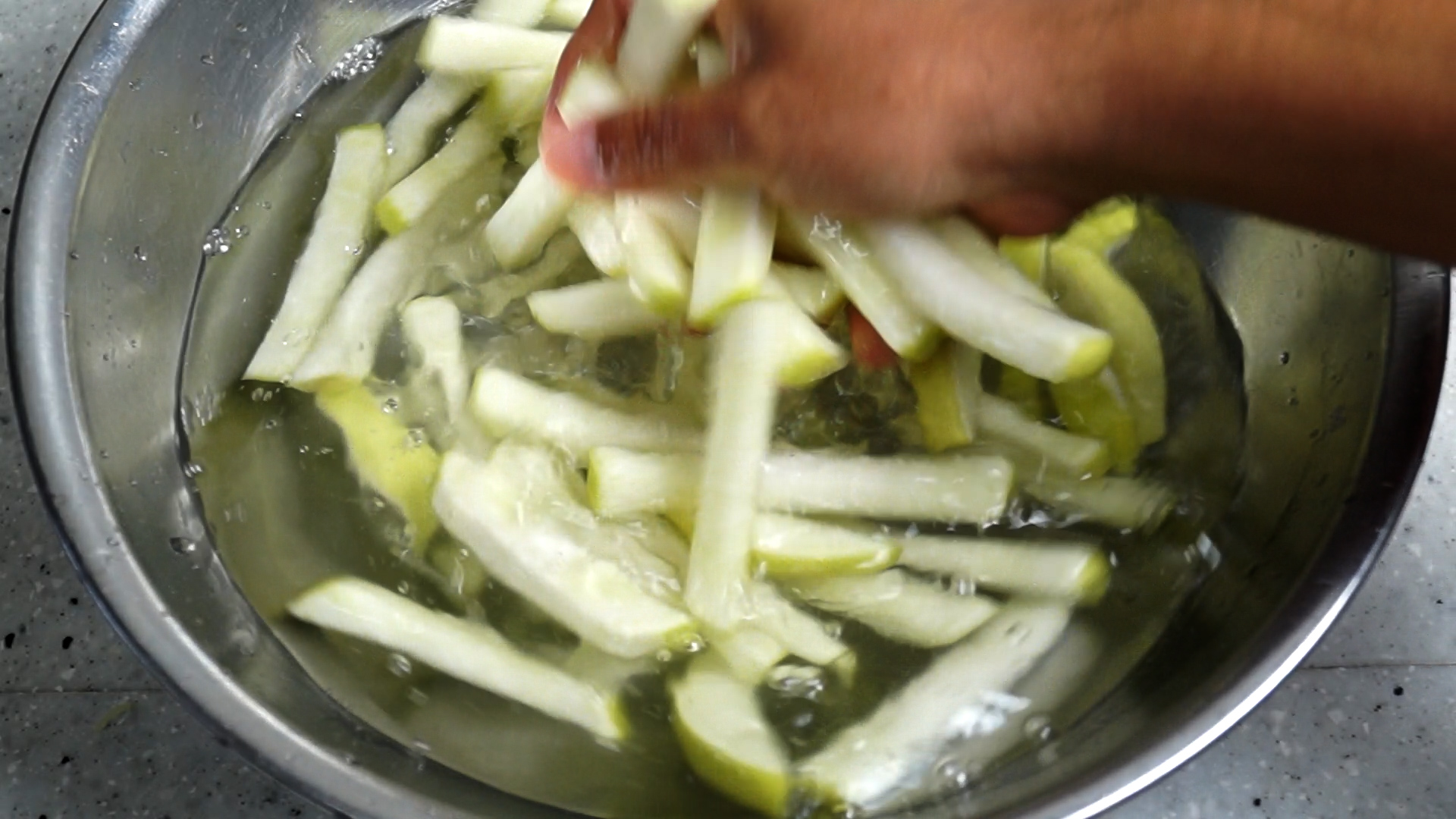 22. 무우를 찬물에 1~2차례 가볍게 헹궈주세요.