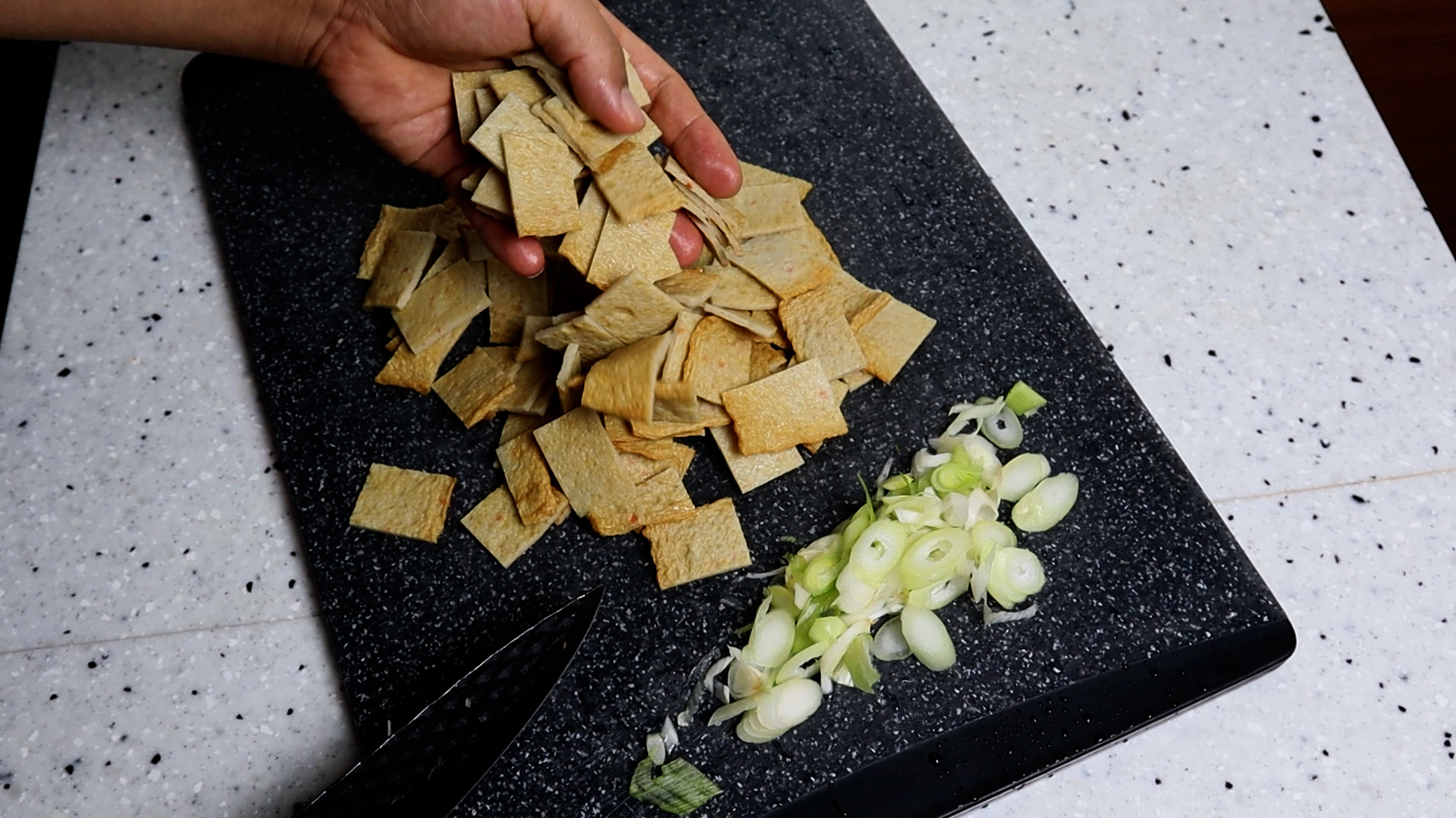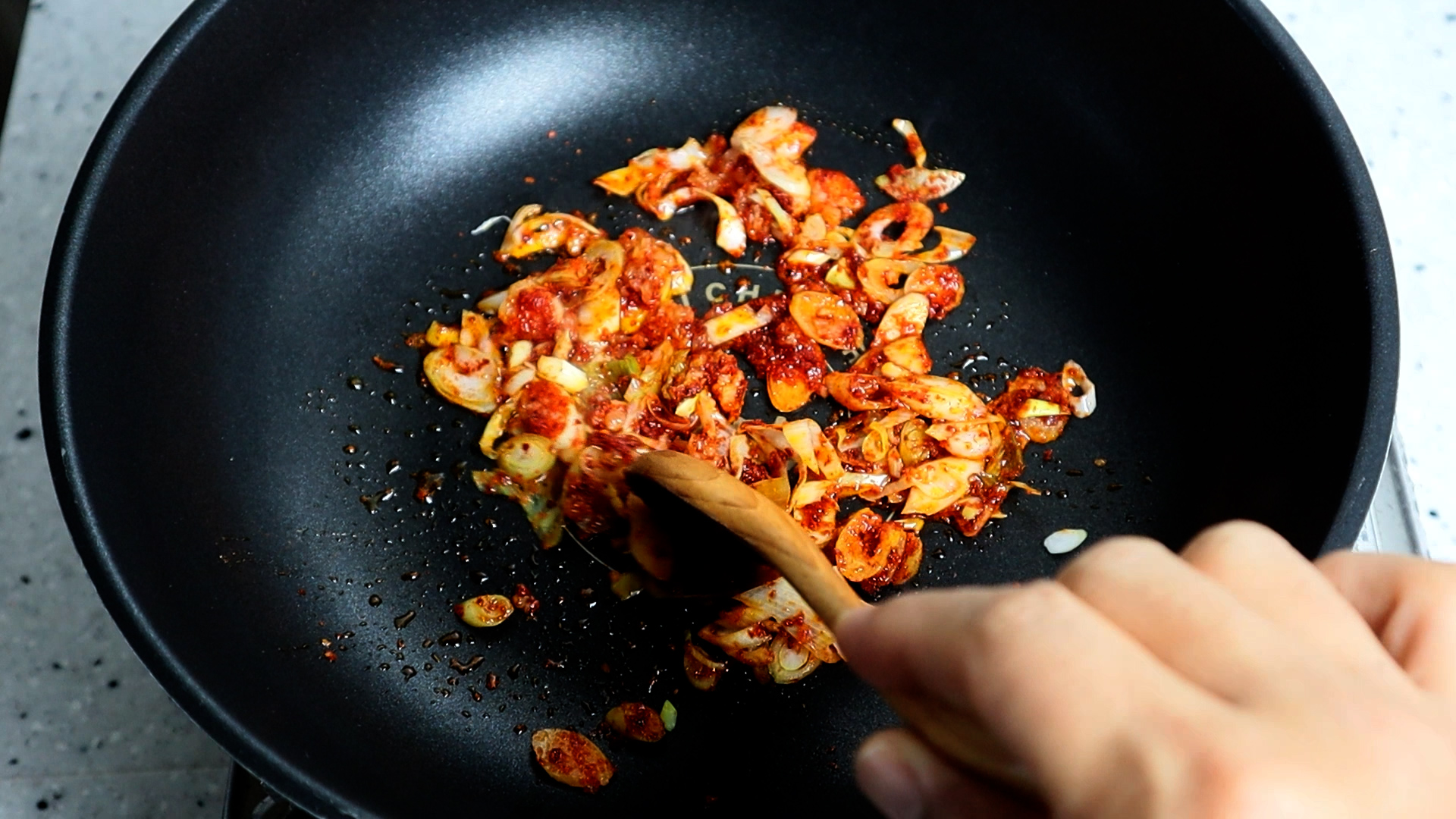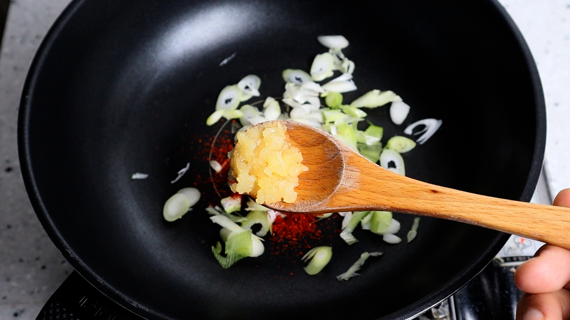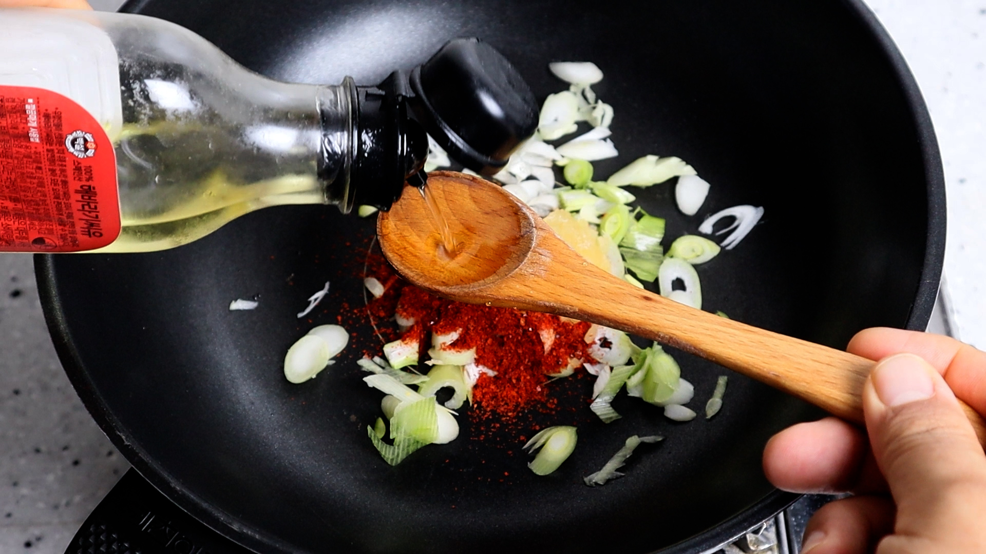 8. 웍이나 팬에 대파를 넣고 고춧가루를 넣어주세요.