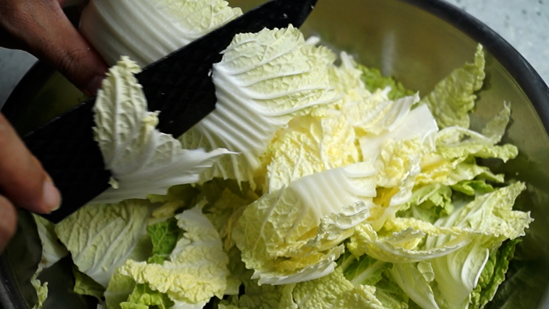 5. 배추 또는 알배추를 볼에 슥슥 썰어 넣어주세요.