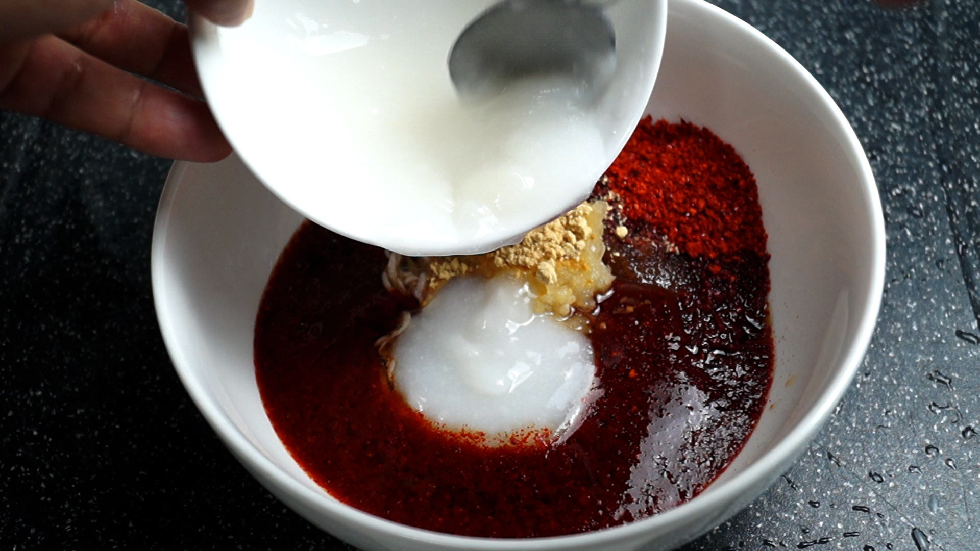 7. 양념란에 표기된 재료를 한데 넣어주세요. 고춧가루는 반찬용 중간입자 고춧가루 쓰시고 액젓은 멸치액젓 또는 까나리액젓 사용해주세요.