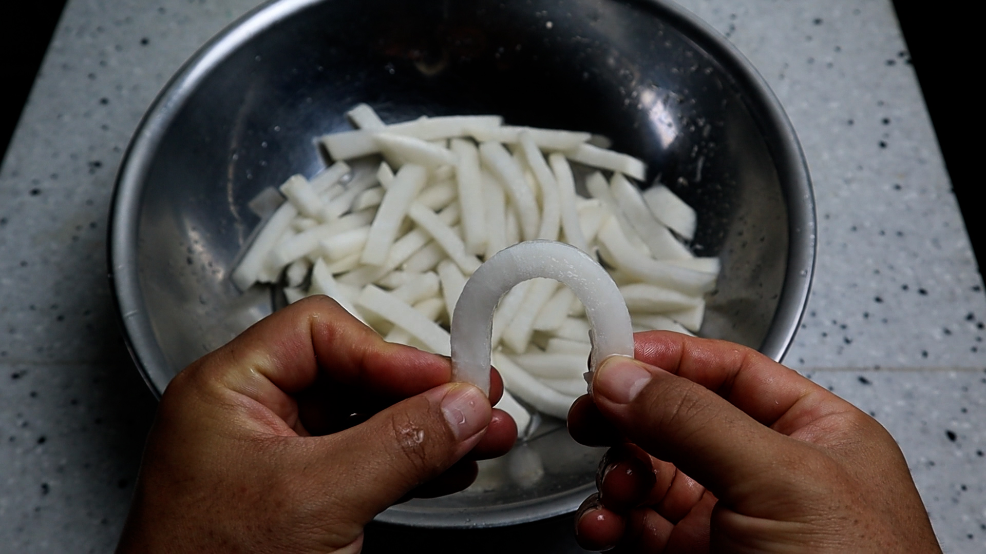 9. 절인 무우가 이정도 구부려도 안부러지면 잘 절인거에요. 혹시 뚝뚝 부러지면 절이는 시간을 늘여주세요.