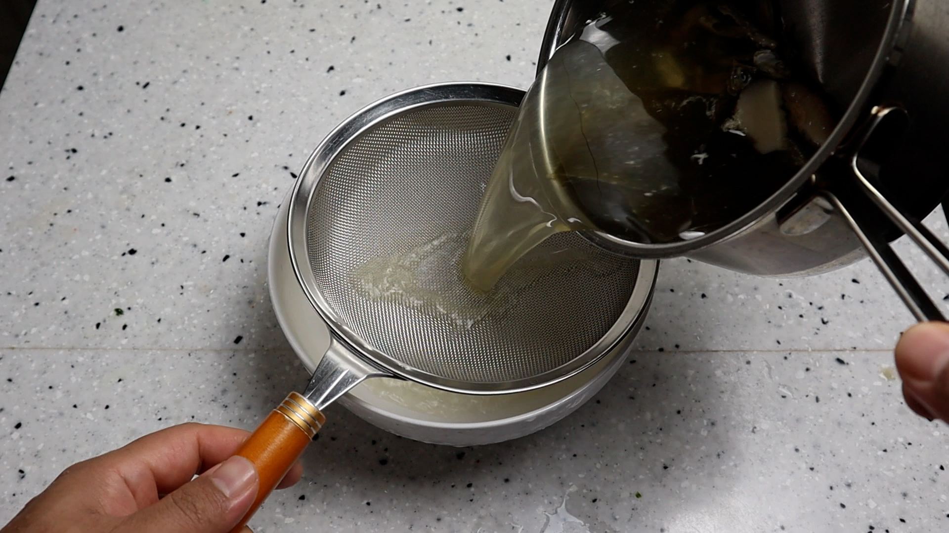 11. 2시간 불린 육수를 건더기만 건지고 따로 따라내주세요.