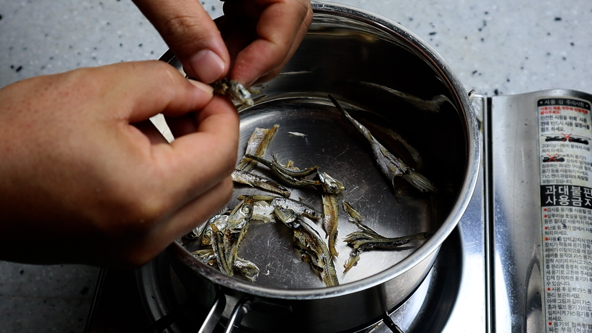 1. 중지만한 길이 대멸 12마리는 머리와 내장을 제거하고 냄비에 넣어주세요.