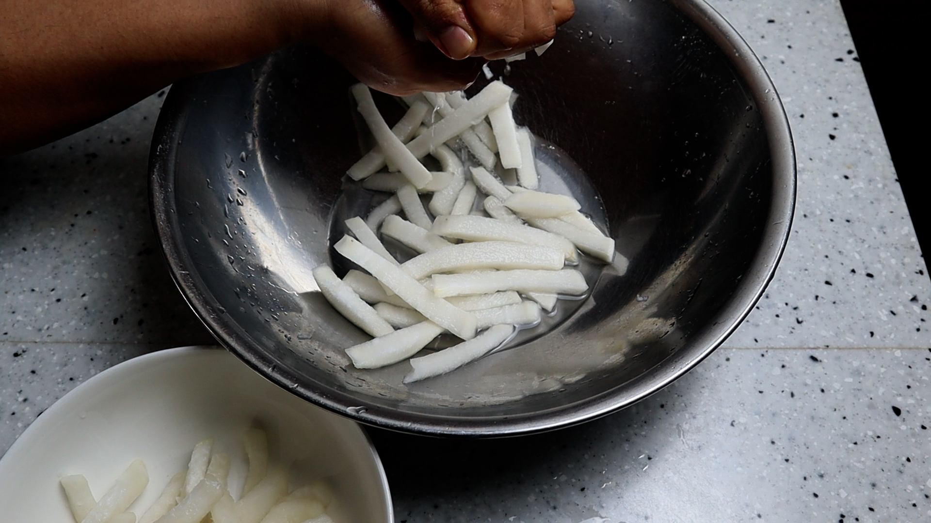 10. 찬물에 한번 헹군 다음에 물기를 꽉!! 짜서 준비해주세요.