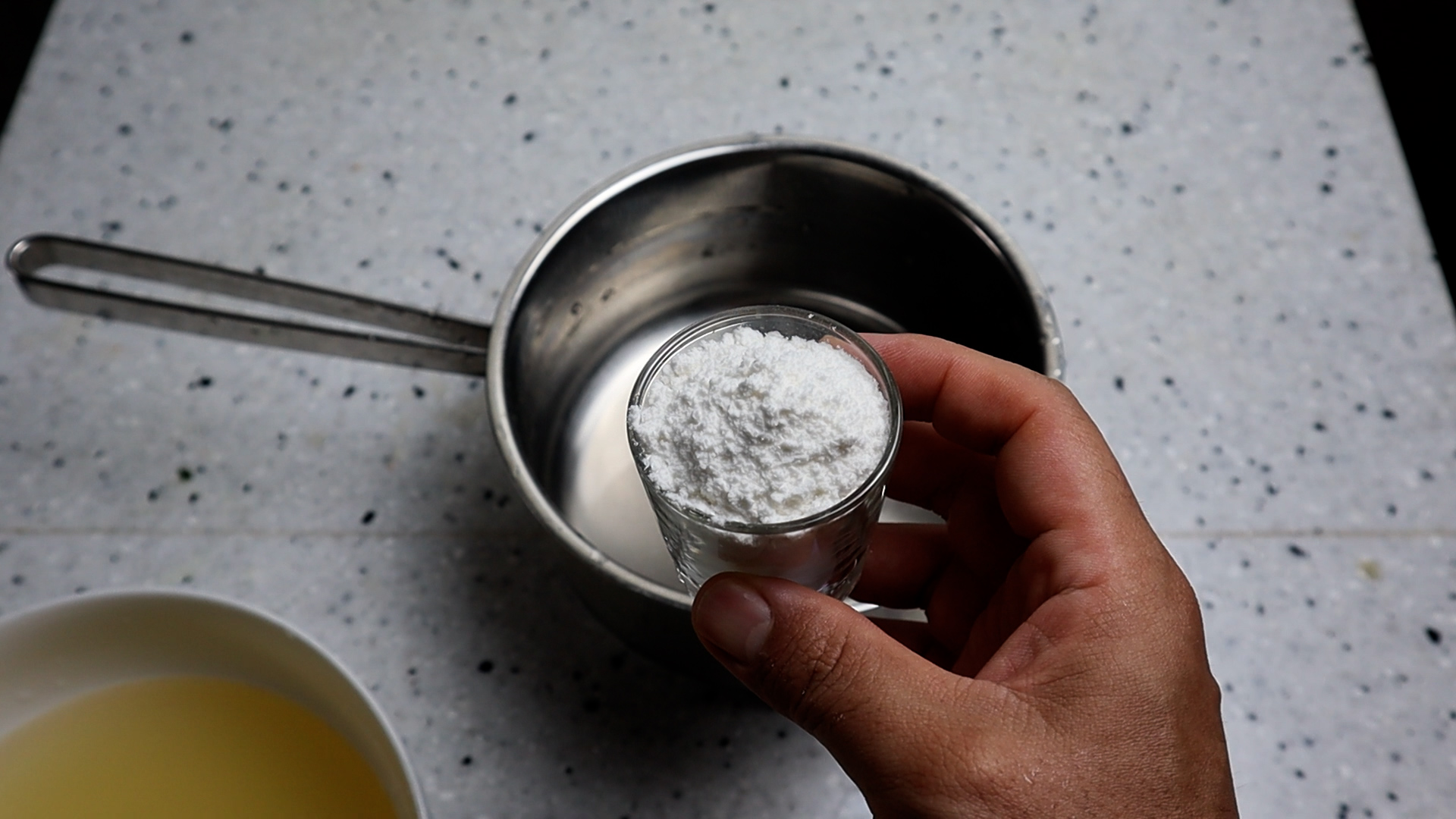12. 만들어둔 육수에 찹쌀가루 부피로 60cc 무게로 35g 넣어주세요. 참고로 소주 1컵 부피가 60cc 입니다.