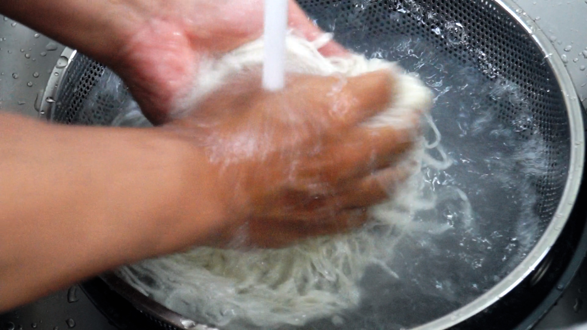 4. 비빔국수엔 필수! 찬물에 3~4차례 박박 문지르며 면을 씻어서 전분기를 빼줍니다.