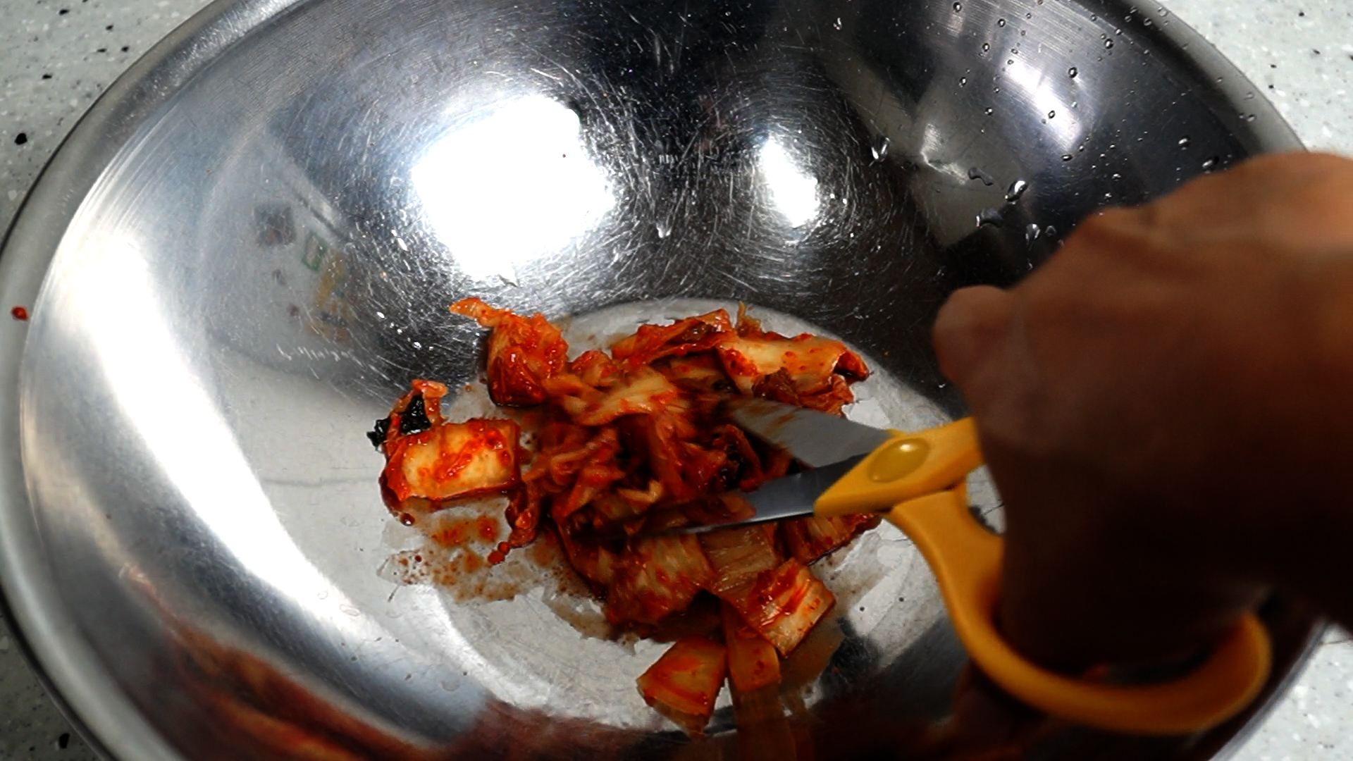 1. 살짝 새콤한 맛이 나기 시작하는 적당히 익은 김치 100g 을 가위로 먹기 좋게 잘라주세요.