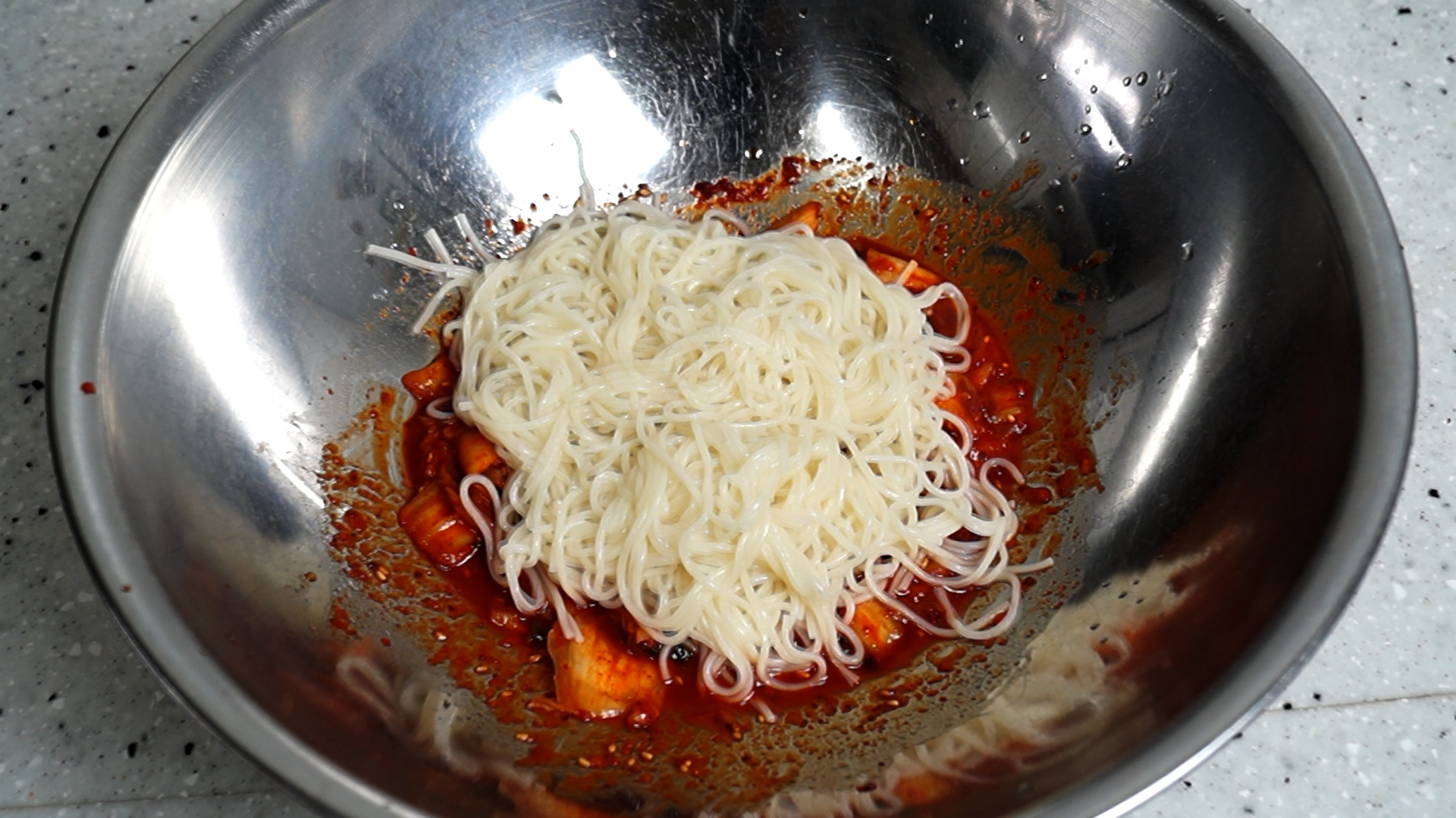 5. 물기를 꽉! 짠 면을 양념에 부어주세요. 주먹에 쥐고 물기를 꽉! 짜주셔야 양념이 싱거워지지 않습니다.