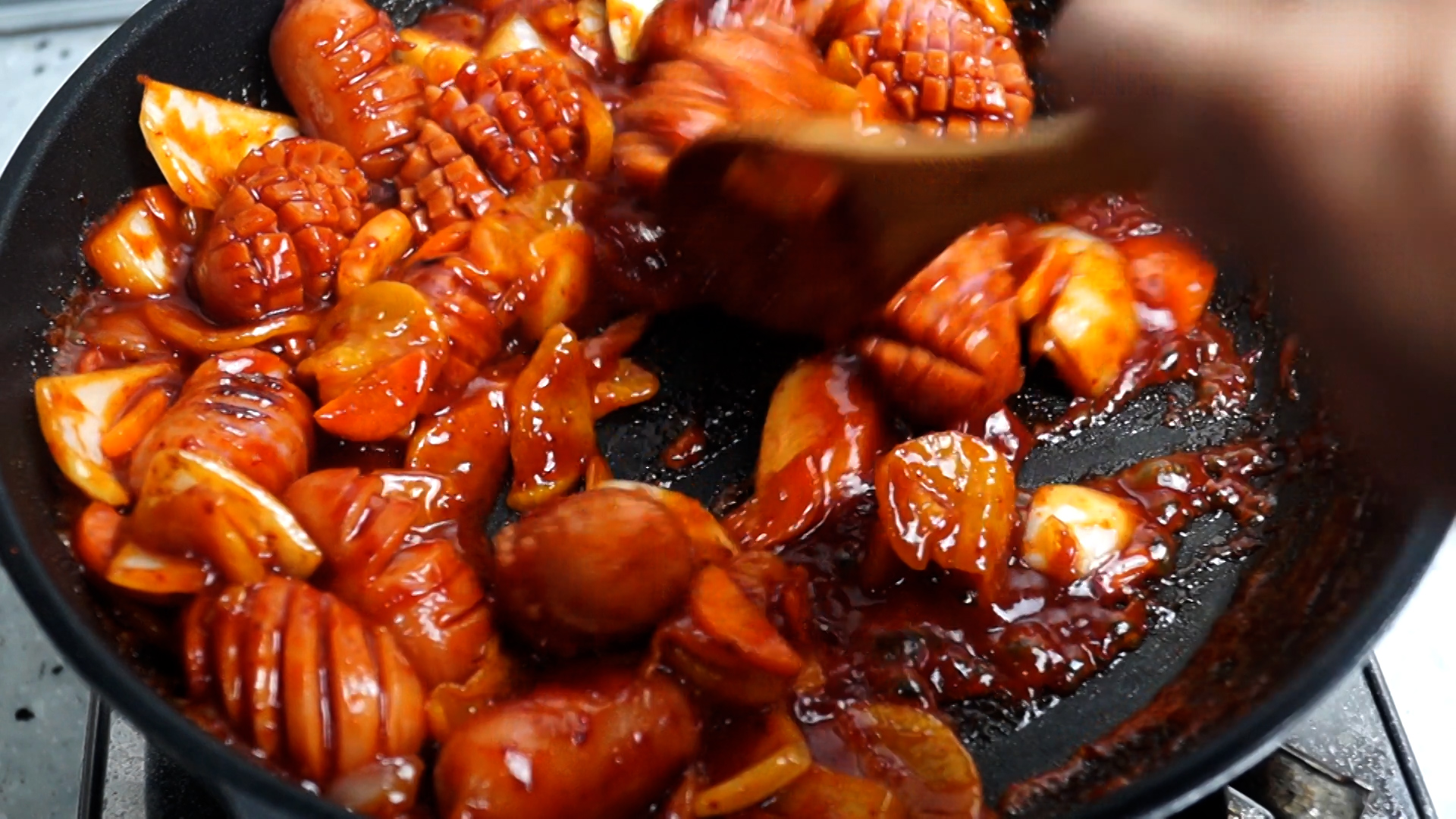 19. 양념을 우선 80% 만 부어서 1분 정도 볶은 다음 양념이 모자라다 싶을때 남은 양념을 더 부어서 1분을 더 볶아주세요.
