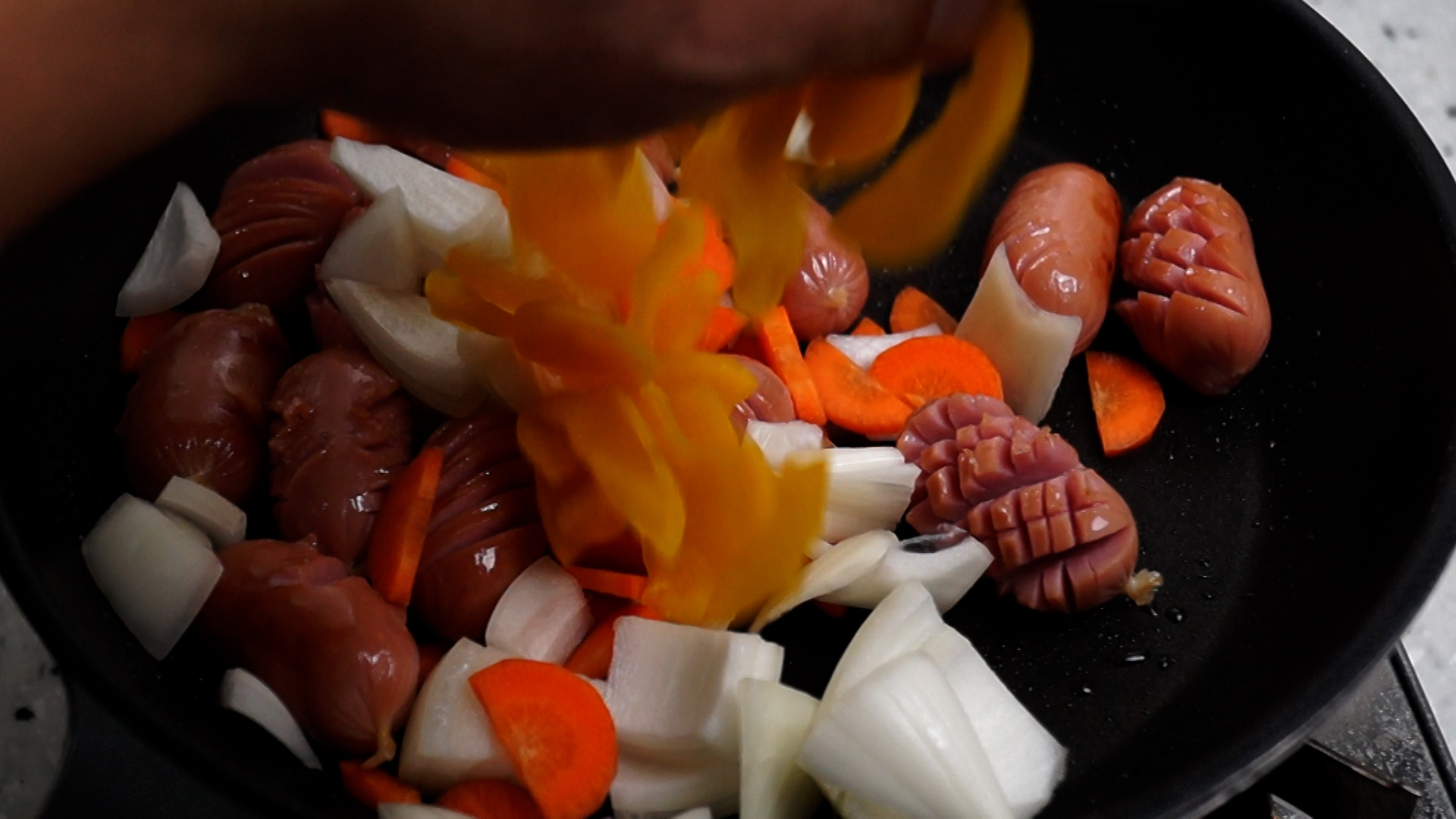 15. 팬에 식용유를 붓고 강불에 소세지 칼집이 벌어지게 1~2분 정도 볶아주세요.