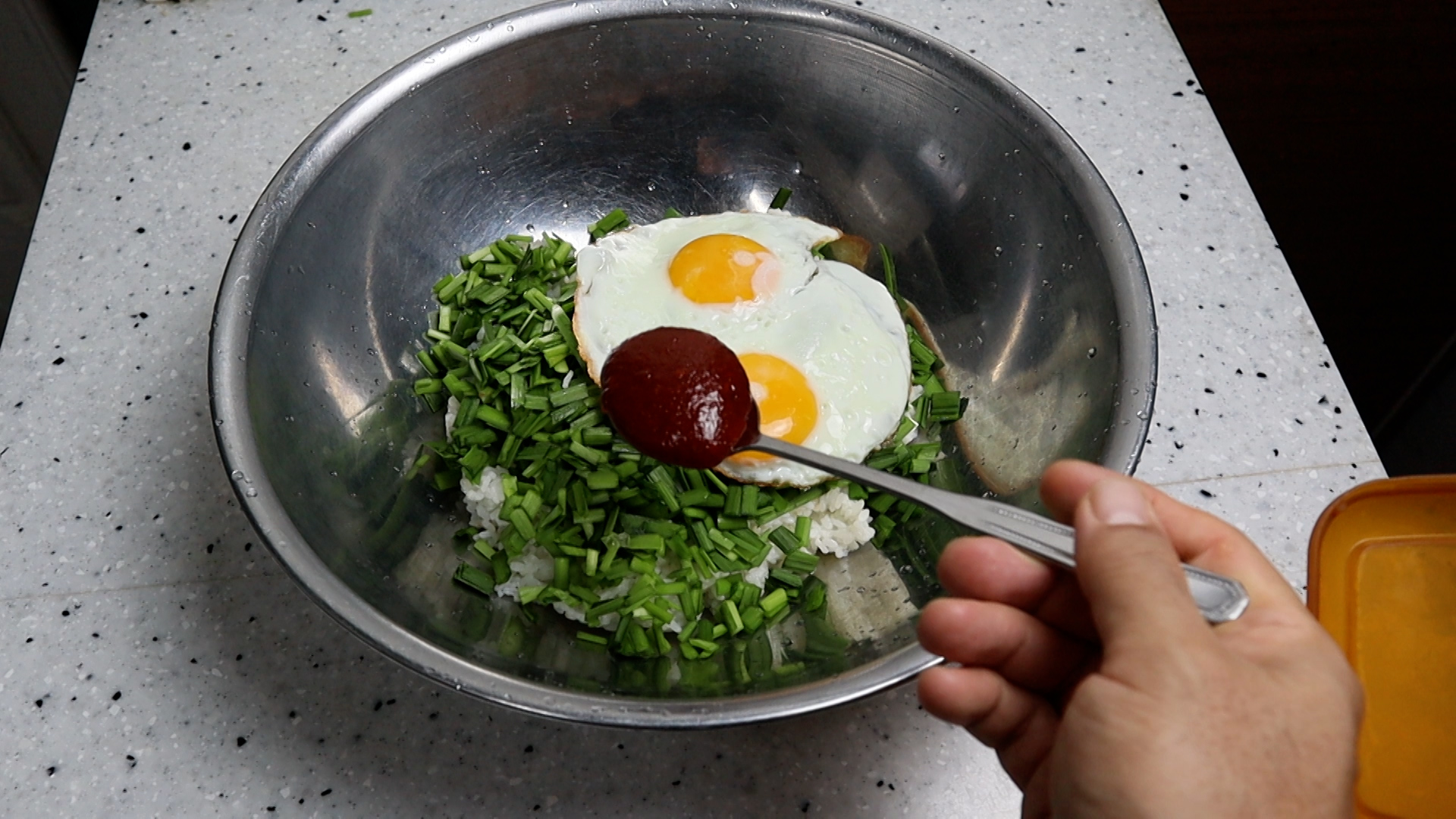 4. 고추장을 적당히 퍼서 1.5 숟갈 넣어주세요. 비벼서 색감보고 고추장을 추가 하거나 밥을 적당히 추가하시면 됩니다~