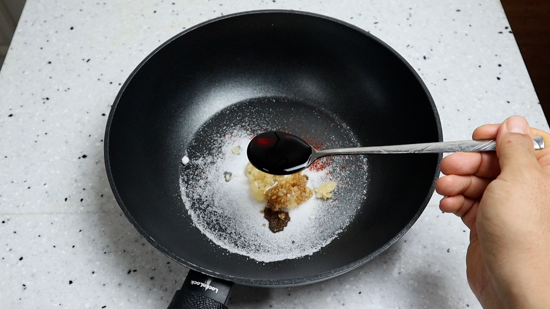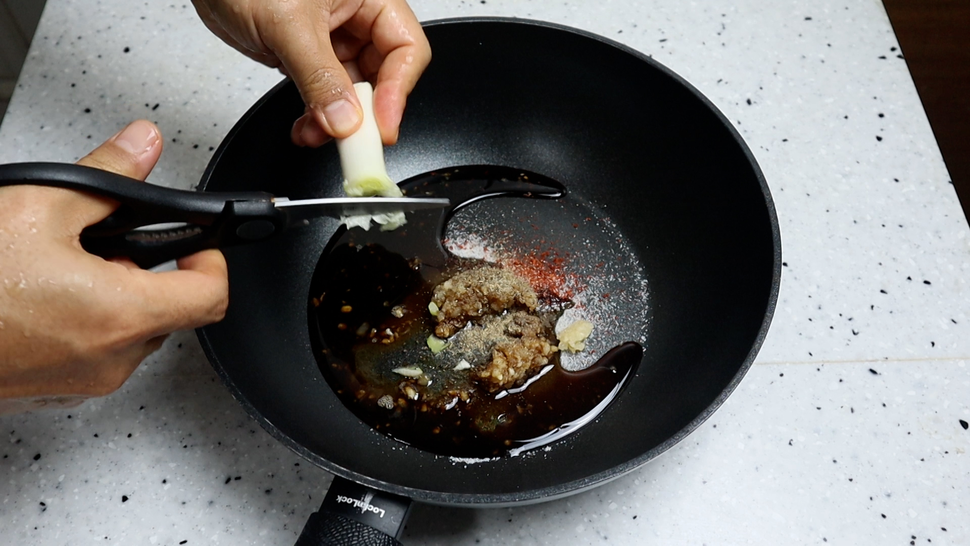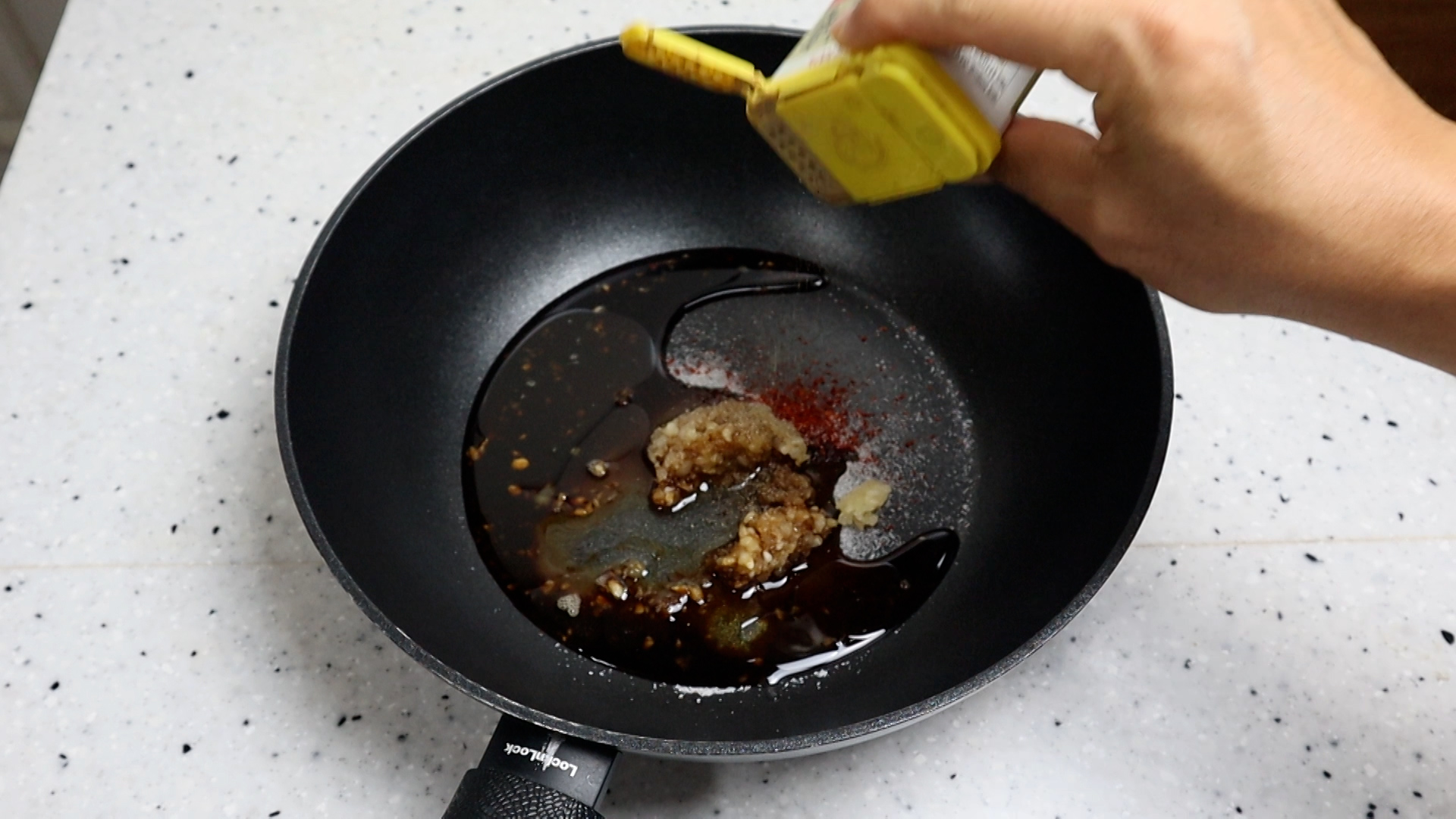 1. 양념란에 재료를 팬에 바로 넣어주세요. 고춧가루는 중간입자 고추가루 사용해주세요.