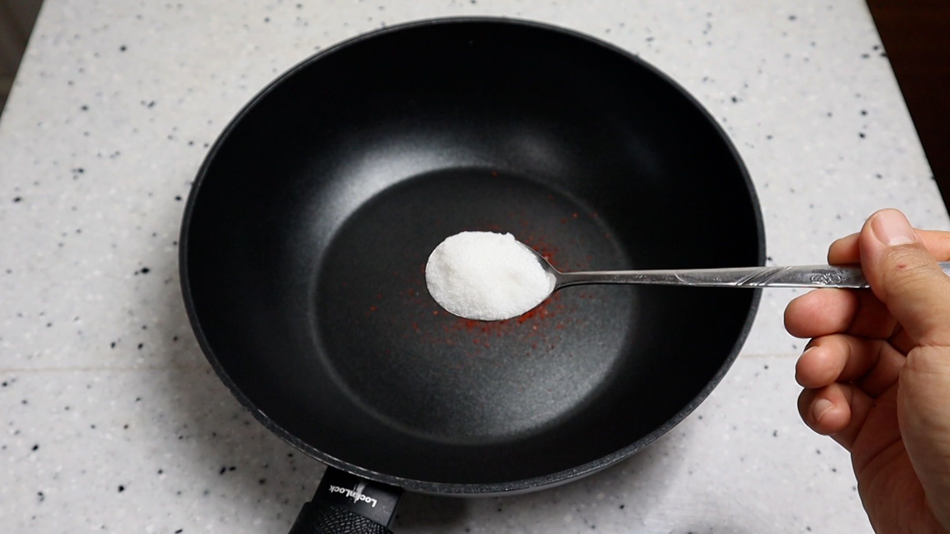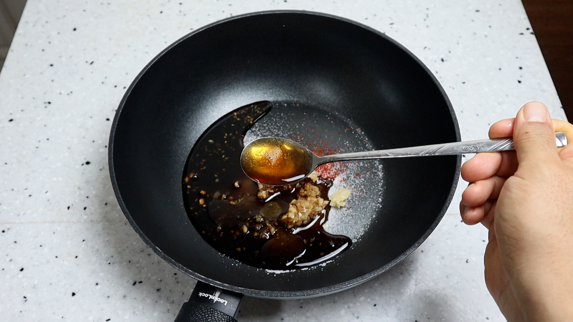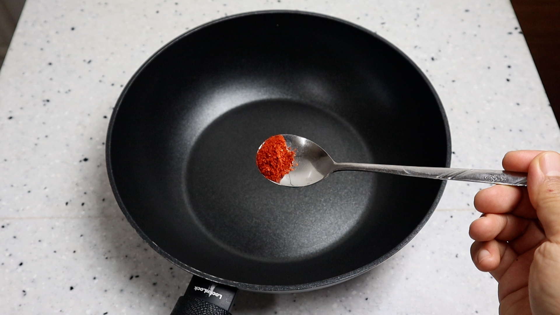 1. 양념란에 재료를 팬에 바로 넣어주세요. 고춧가루는 중간입자 고추가루 사용해주세요.