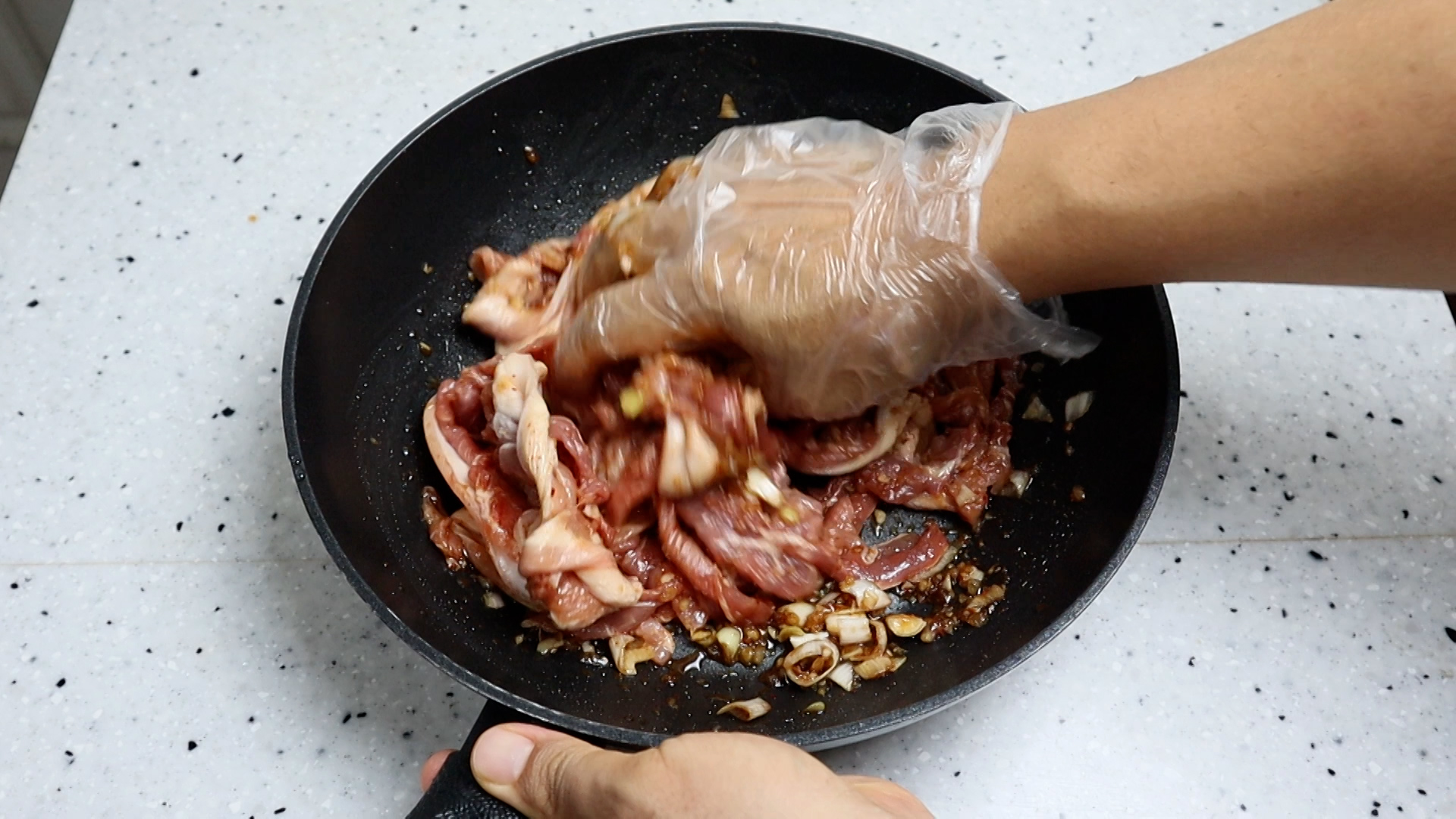 10. 돼지앞다리살을 얇은걸로 넣어주시고 골고루 버무려주세요. 비닐장갑 없을땐 그냥 바로 올리고 구워가면서 고기와 양념을 골고루 섞어주세요.