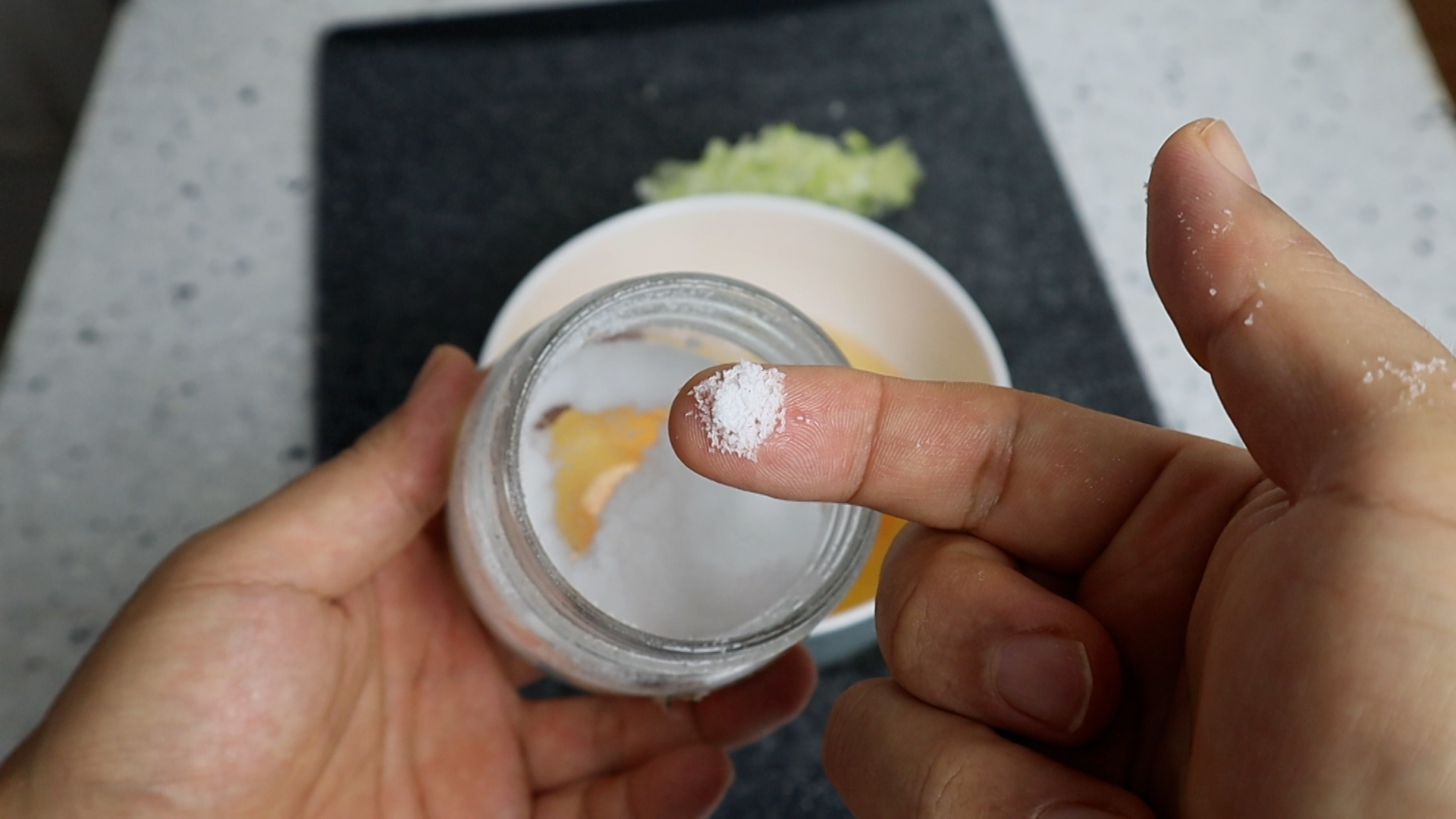 3. 맛소금은 이정도로 집어서 3꼬집 넣어주세요. 계란에 미리 간을 하면 더 맛있더라고요~