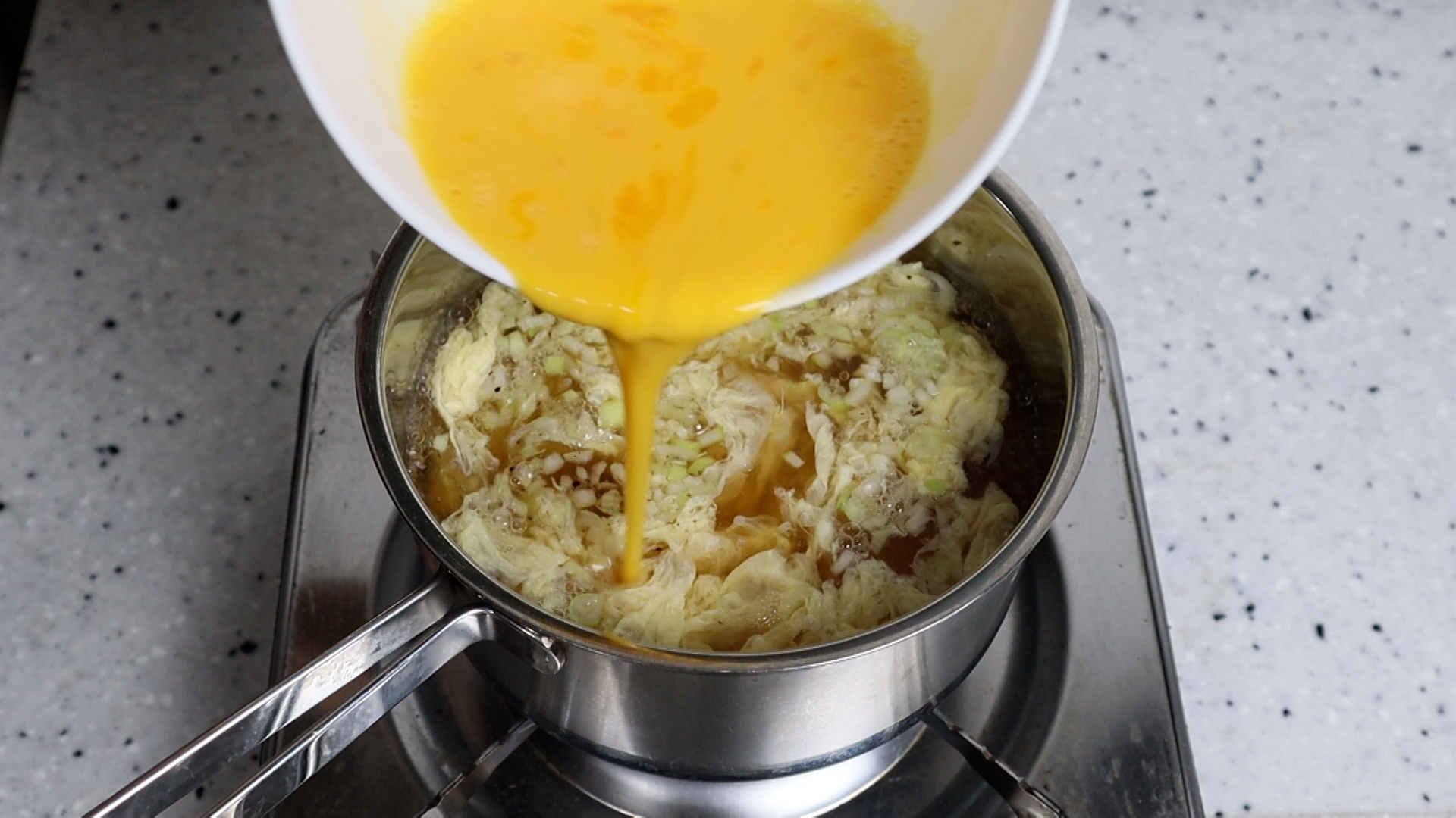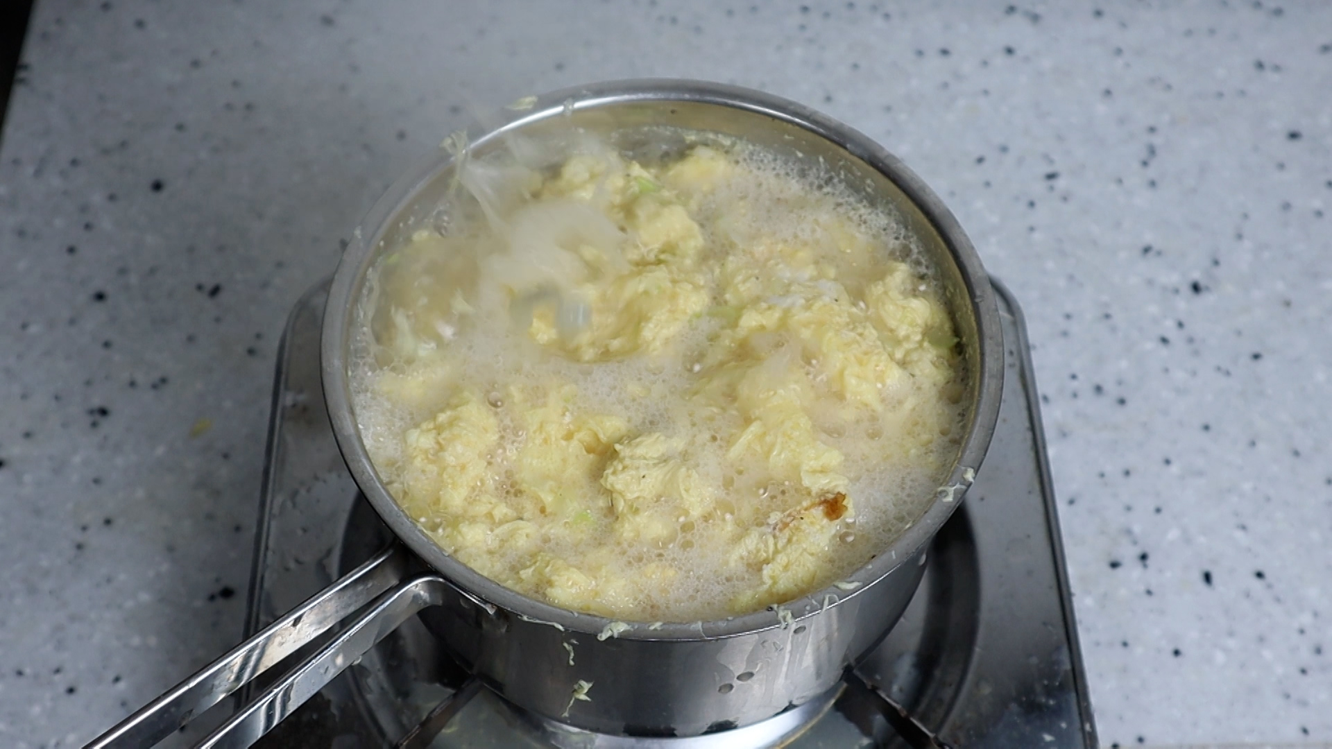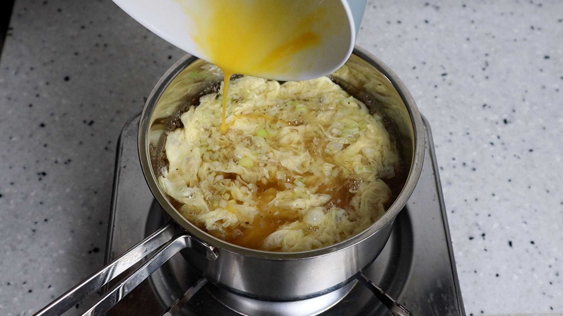 13. 국물이 끓기 시작하면 계란물을 한번에 붓지 말고 휘휘 둘러가면서 몽글몽글 피어 오르게 부어주세요.