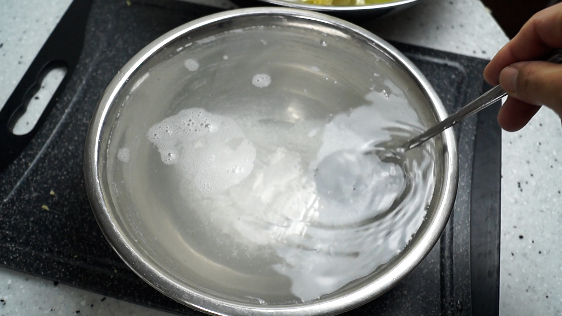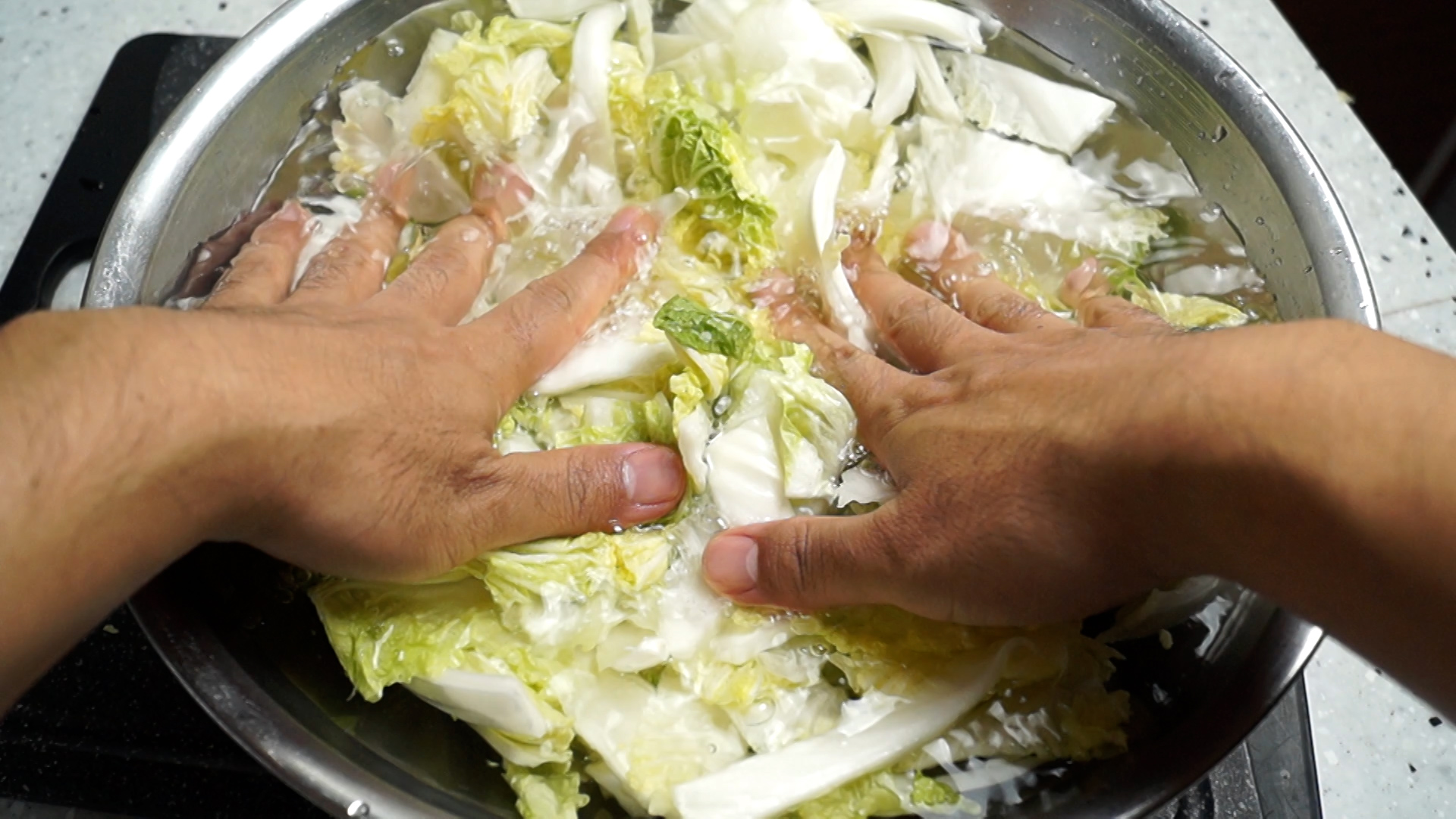 2. 배추절이기 란에 물과 소금을 넣고 소금을 녹여주세요.
