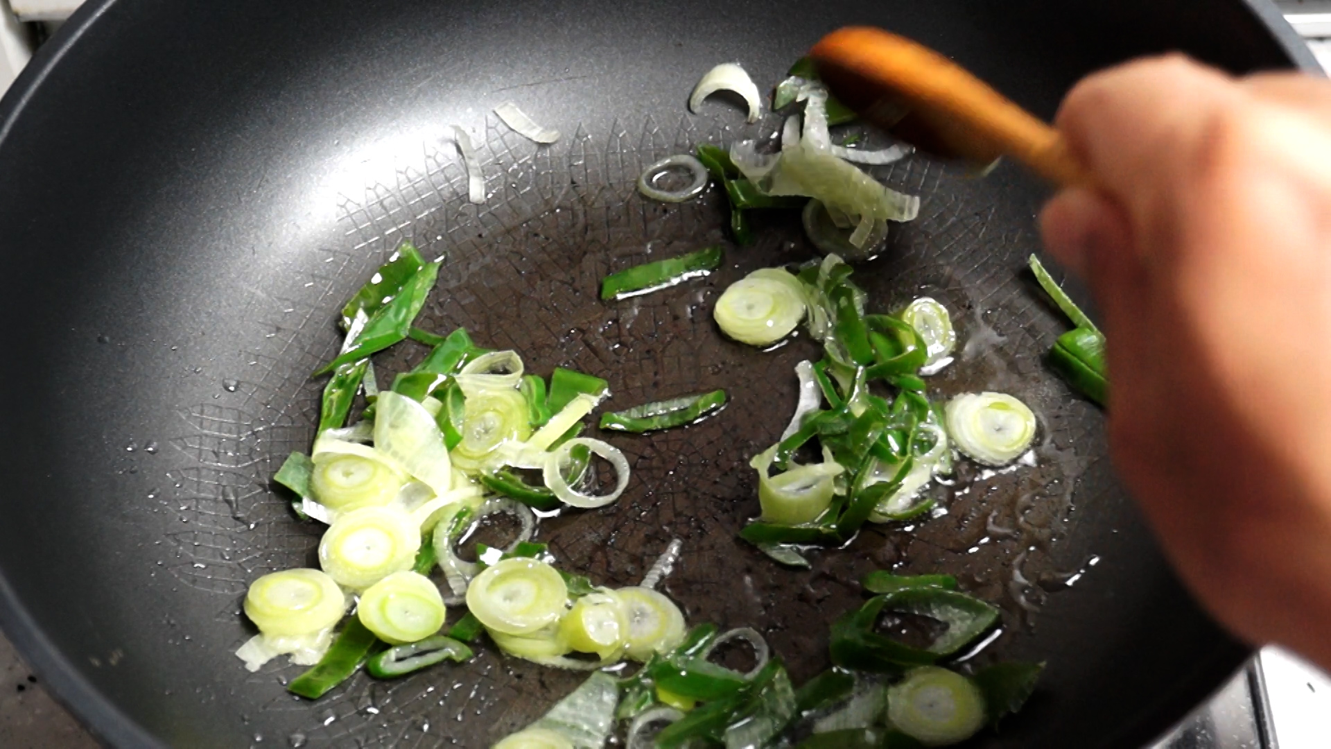 6. 팬에 대파와 식용유를 넣고 약불에 자글거리면 2분 정도 볶아주세요.