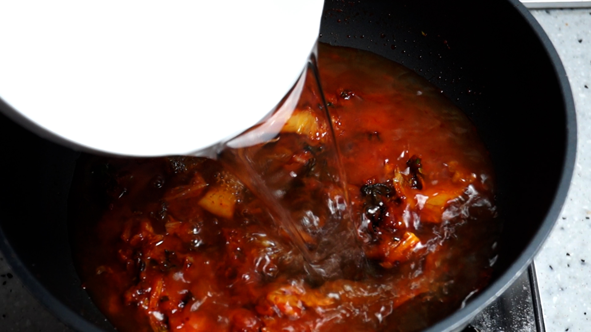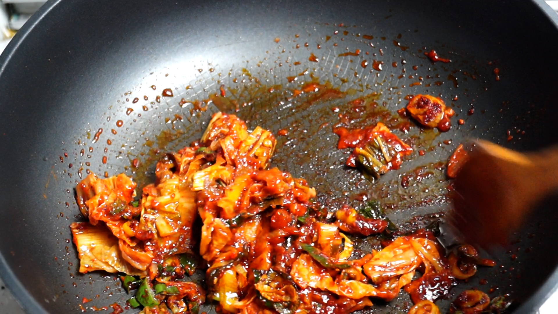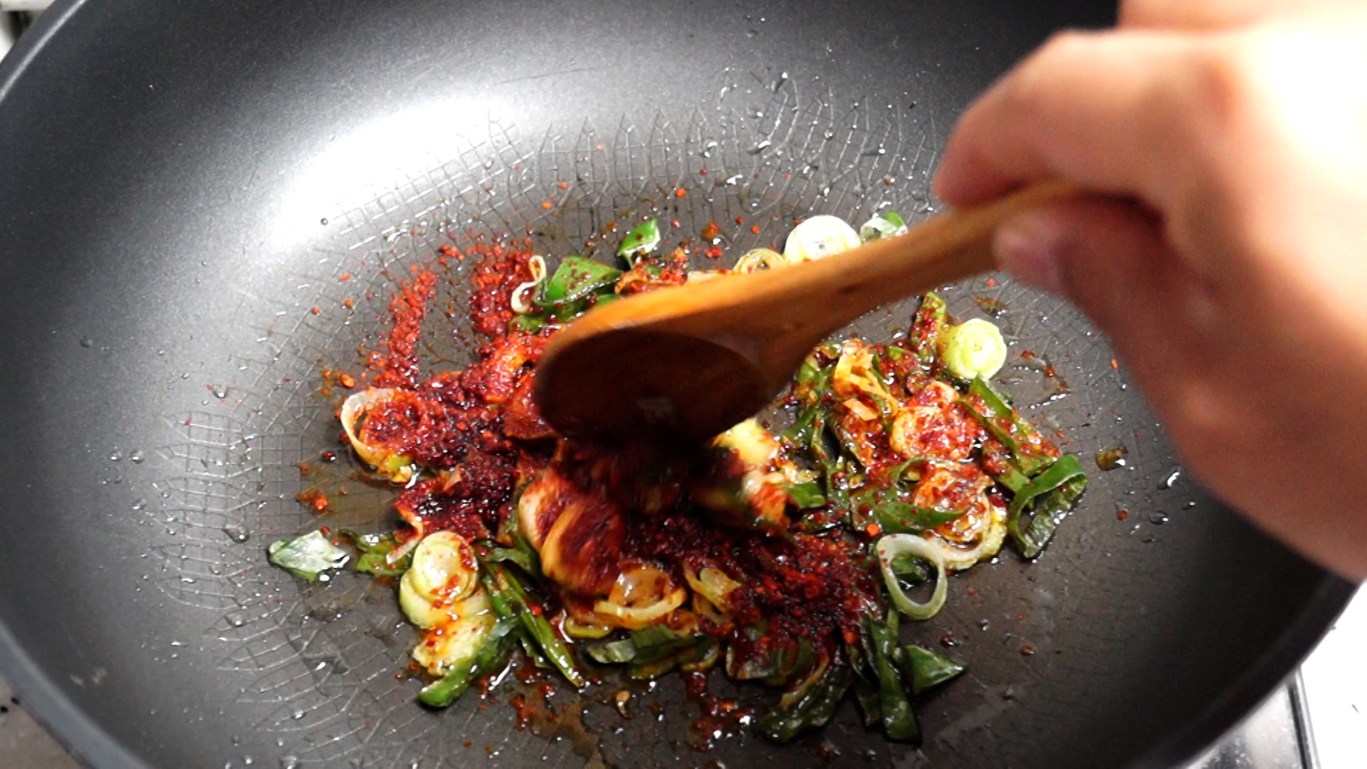 7. 고춧가루 넣고 약불 유지하고 1분을 더 볶아주세요.
