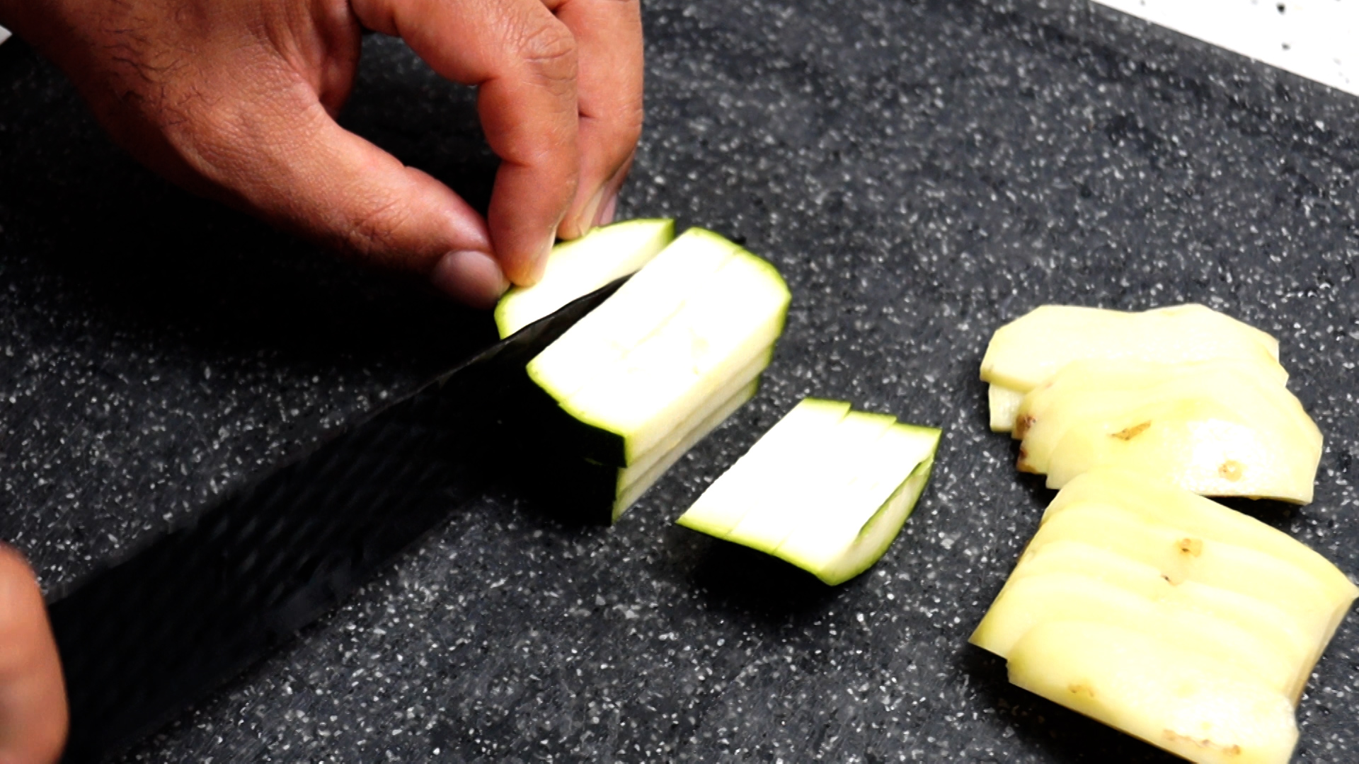 5. 호박은 감자보다 두껍게 썰고 크기는 기호에 맞게 썰어주세요.