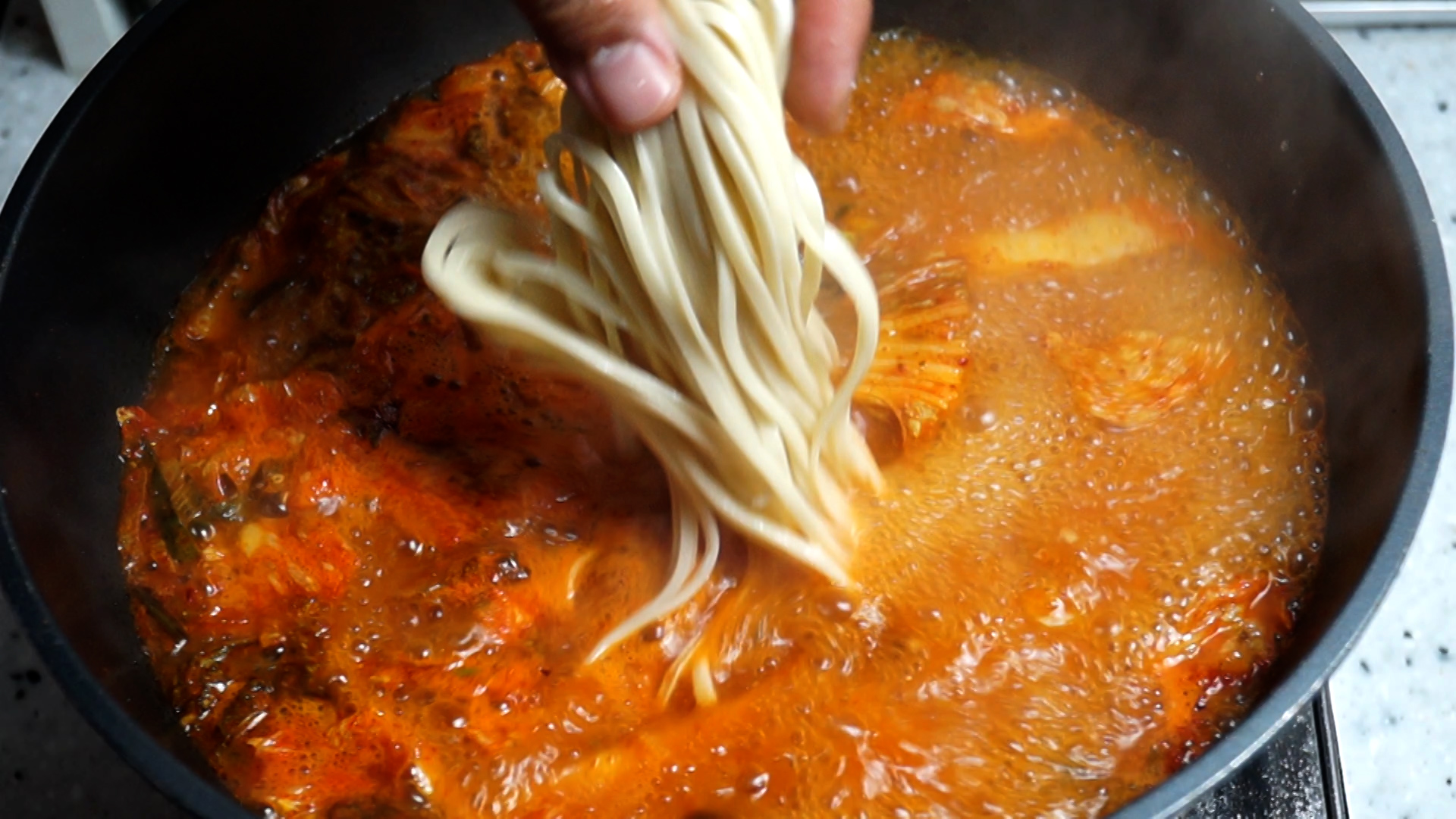 16. 물이 팔팔 끓기 시작하면 감자를 넣은 다음 칼국수를 넣고 2분을 끓여주세요. 칼국수는 생면이냐 건면이냐 따라 조리법이 달라집니다. 제가 사용한건 생면 기준이라 건면 사용시엔 물을 적당량 더 추가해주셔야 합니다.