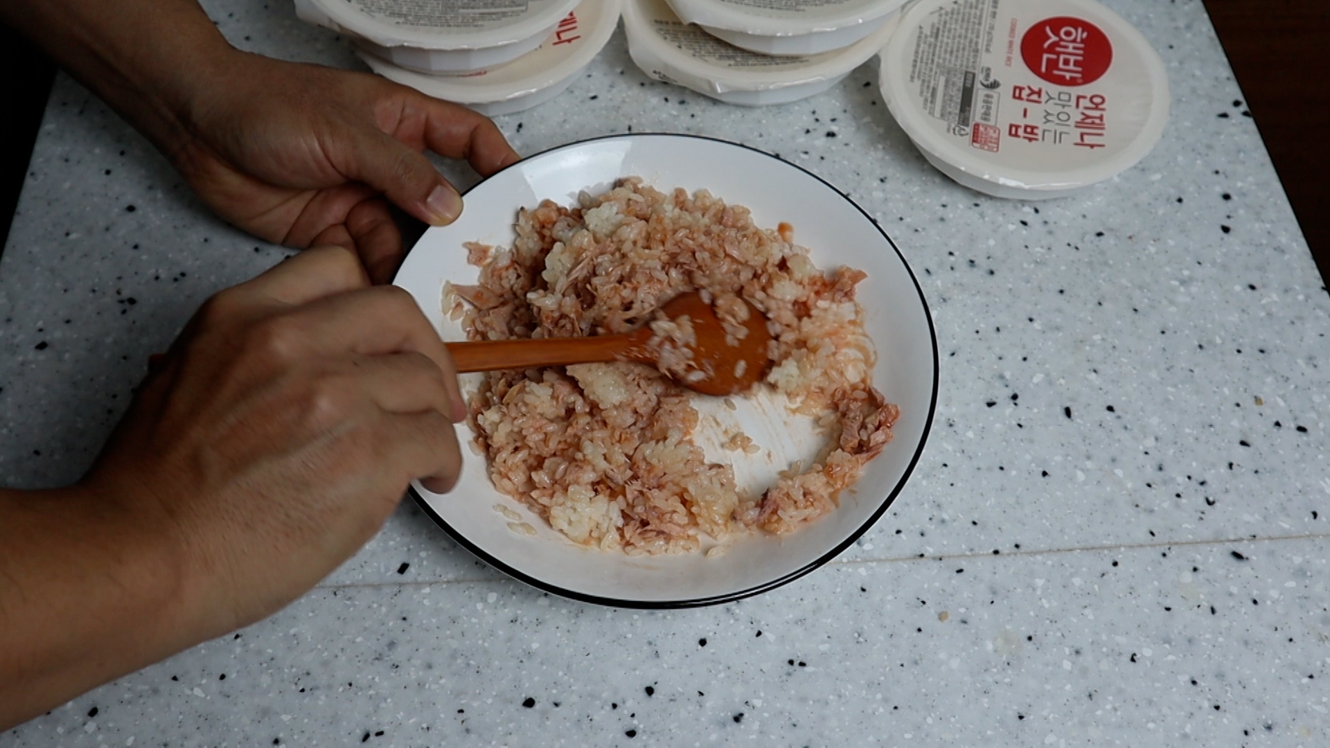 5. 햇반 한개당 작은참치 2/3캔 정도 넣어주세요. 밥을 더 하셨으면 1캔 다부어주세요.