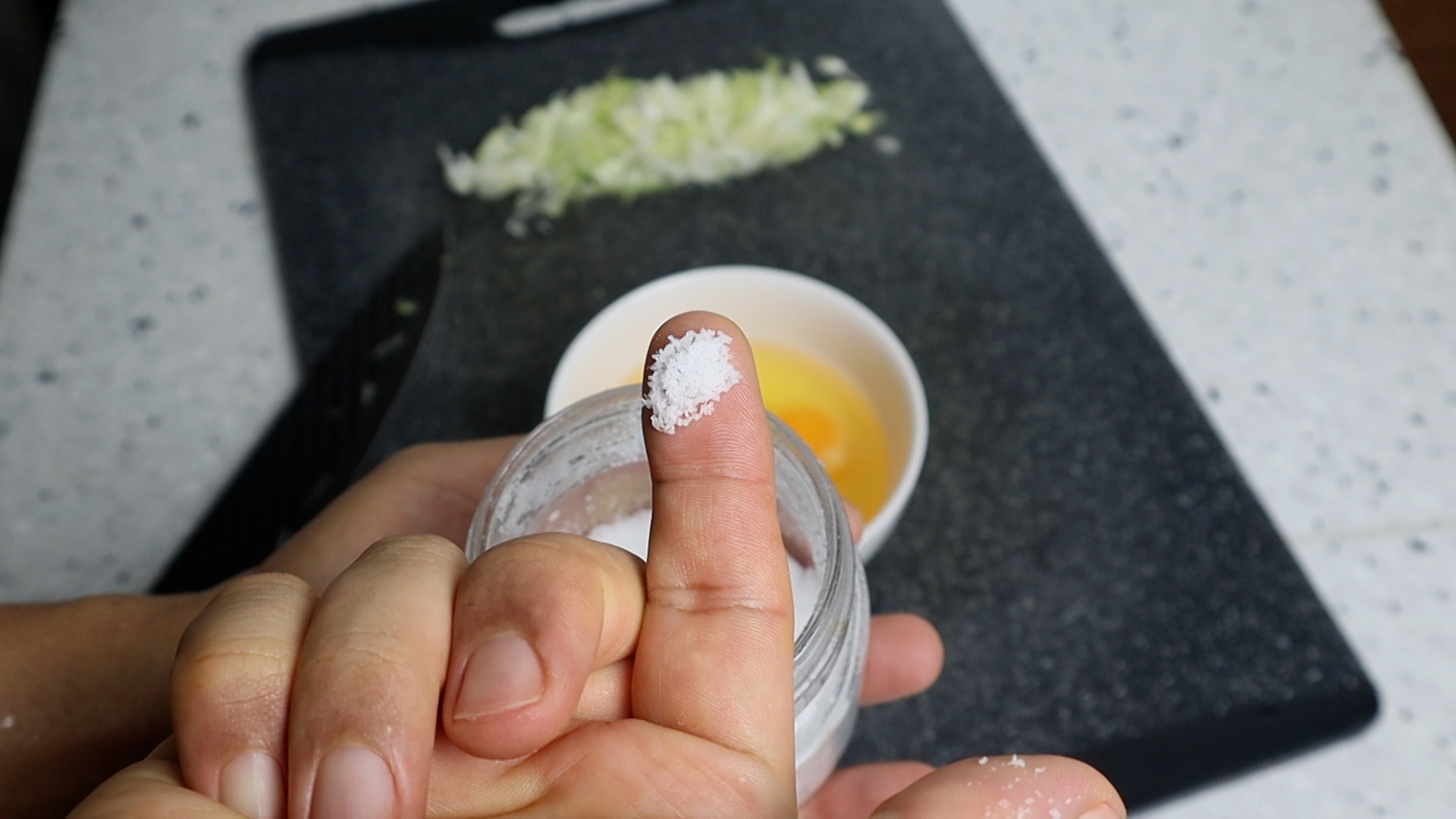 2. 계란 3알을 볼에 까넣고 맛소금을 요만큼 집어서 2꼬집을 넣어주세요. 계란에 미리 간을 해 놓으면 볶음밥 씹을때 계란 맛이 겉도는 느낌이 없어 좋더라고요~