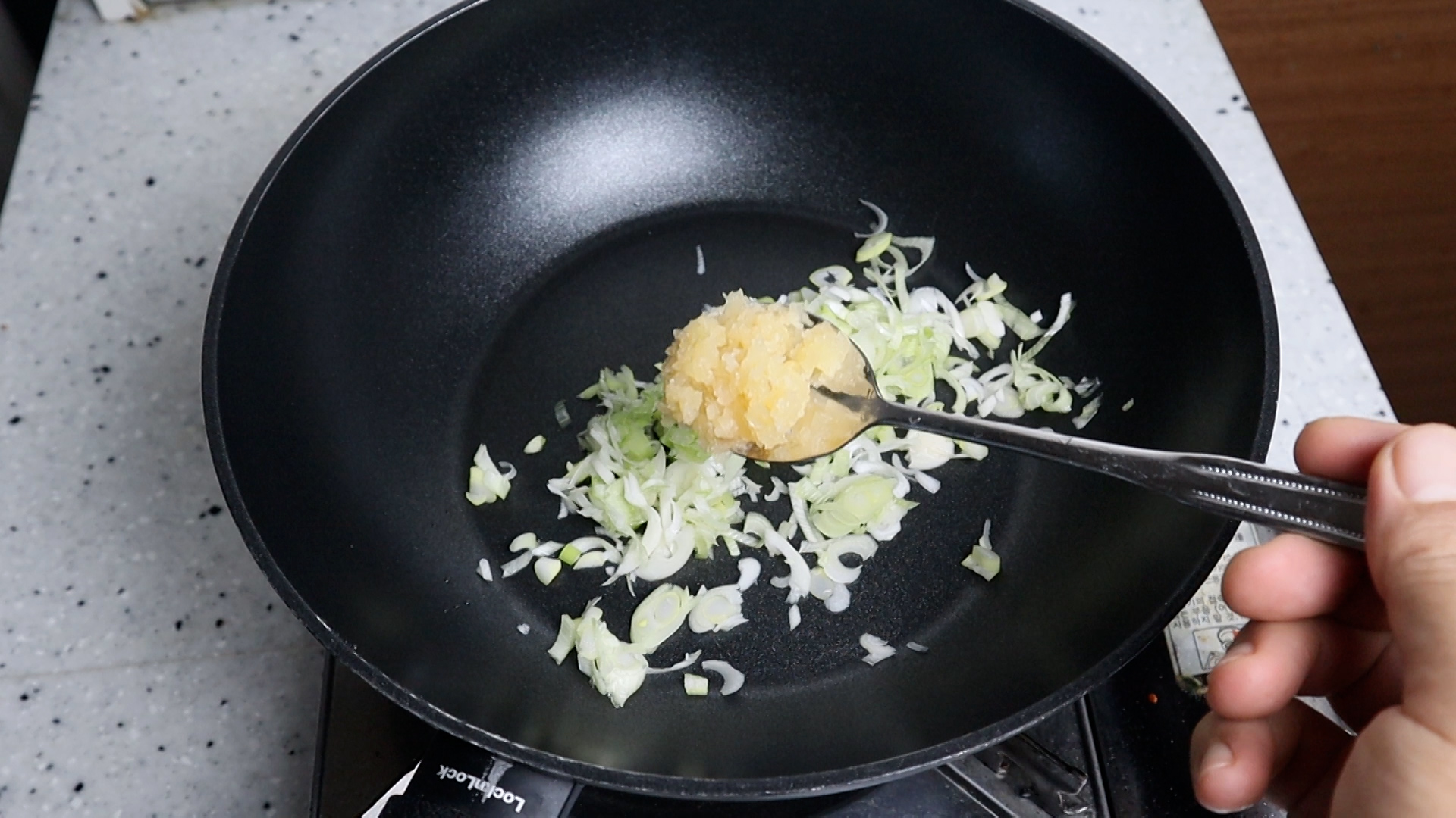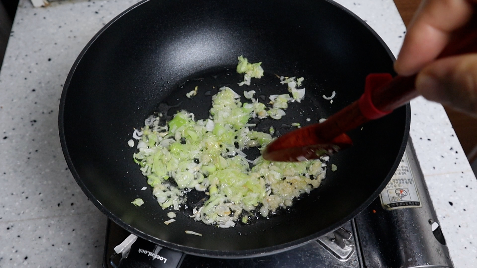 9. 코팅팬에 썰어둔 대파와 간마늘을 넣어주세요.