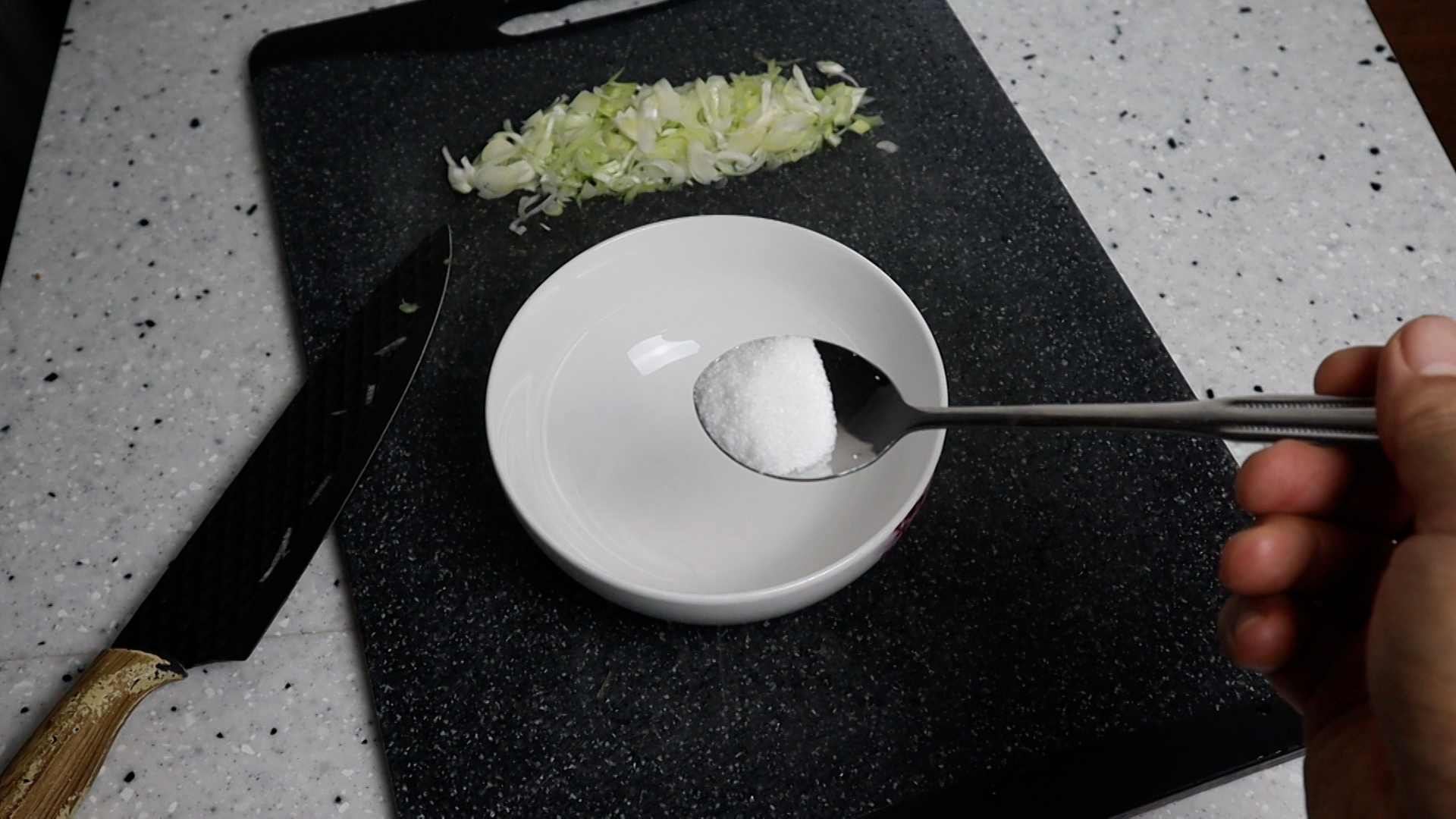 4. 양념란에 있는 재료를 한데 섞어주세요. 설탕을 살짝 깍아서 넣어주세요.