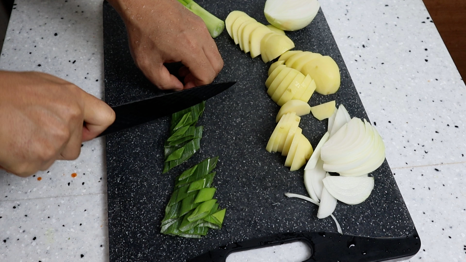 13. 감자를 0.5cm 두께로 썰고 나머지 크기는 기호에 맞게 썰어주세요.