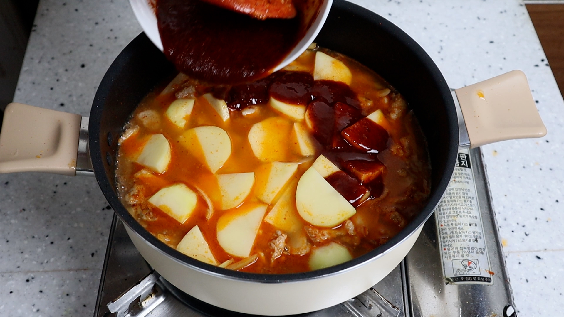 19. 물과 감자를 넣고 양념도 전부넣어주세요.
