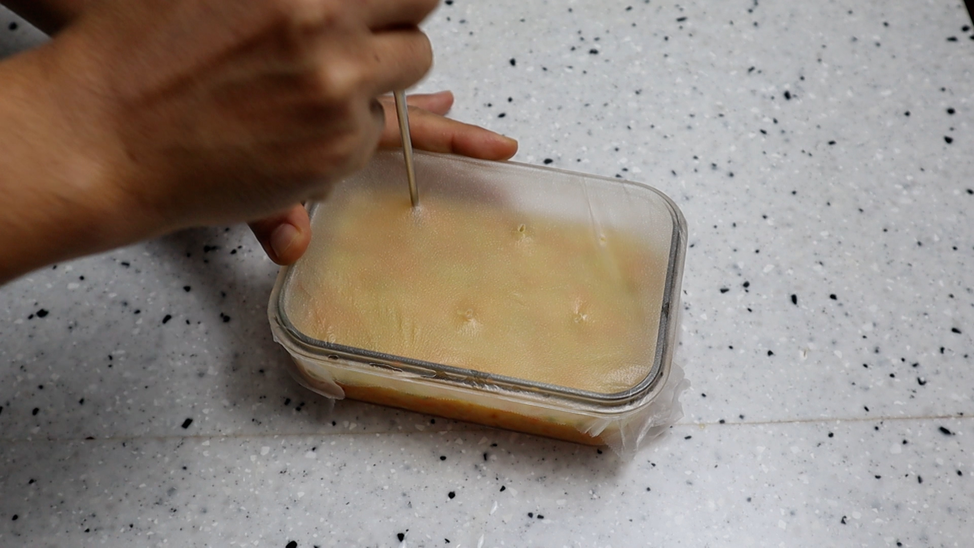 9. 전자렌지 전용 랩을 덮어서 구멍을 10개 정도 뚫어주세요.