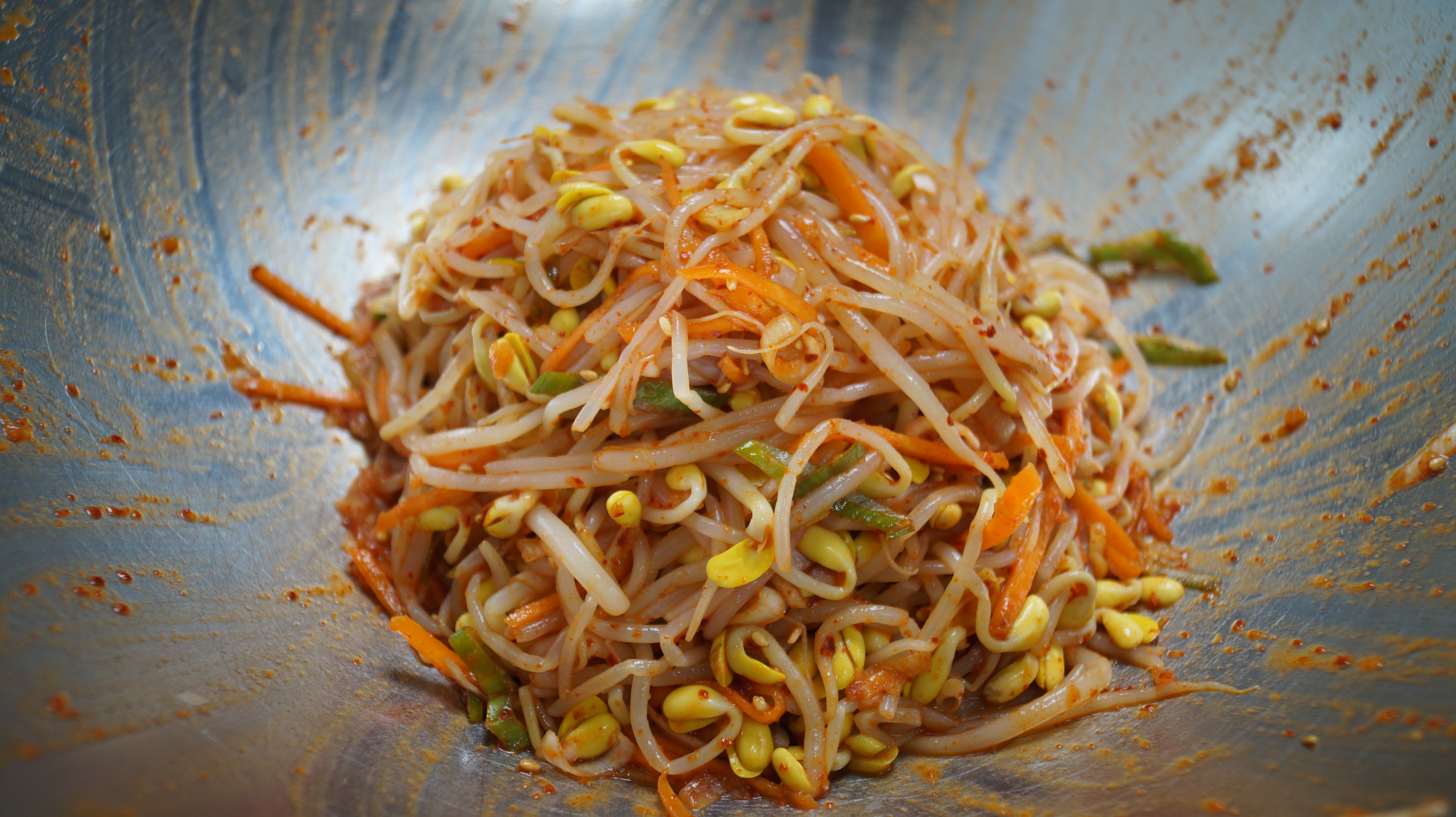 14. 물기를 탈탈 털어낸 식힌 콩나물을 양념에 넣고 버물버물 버무려주세요~