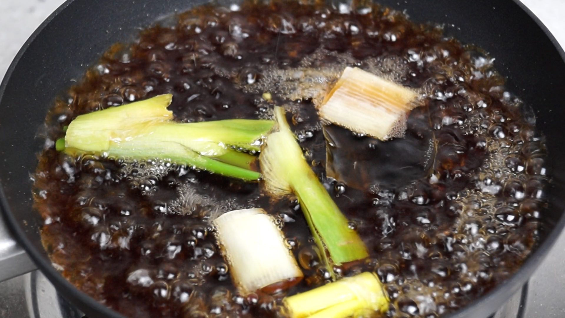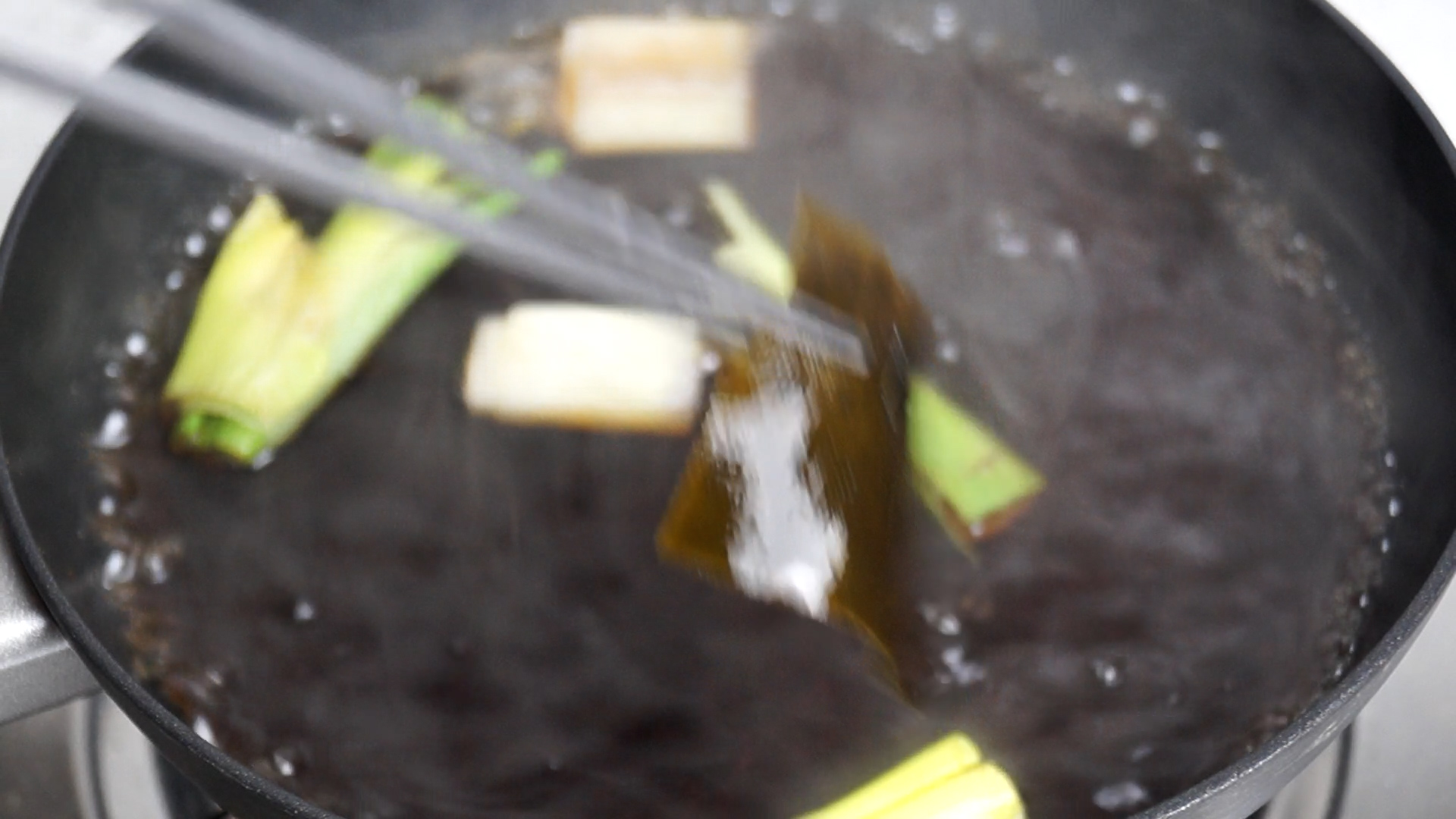 2. 소스가 끓으면 딱 10초만 끓인 다음 다시마는 건져버리거나 감칠맛을 더 뺄려면 연어에 붓기 전까지 그냥두세요.