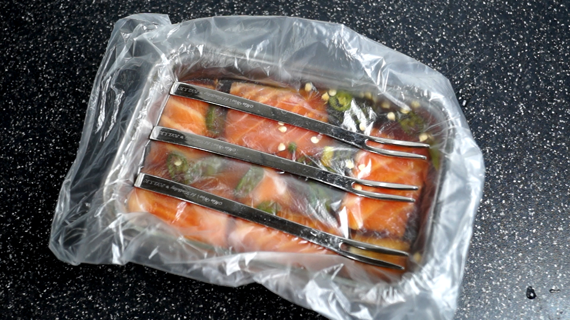 7. 위생비닐을 뒤집어서 연어장 위에 덮고 포크 같은걸로 눌러주세요. 비닐로 눌러주면 공기와의 접촉을 최소화 시켜 산폐를 늦춰주고 연어 윗부분 까지 양념에 골고루 베일수 있습니다.