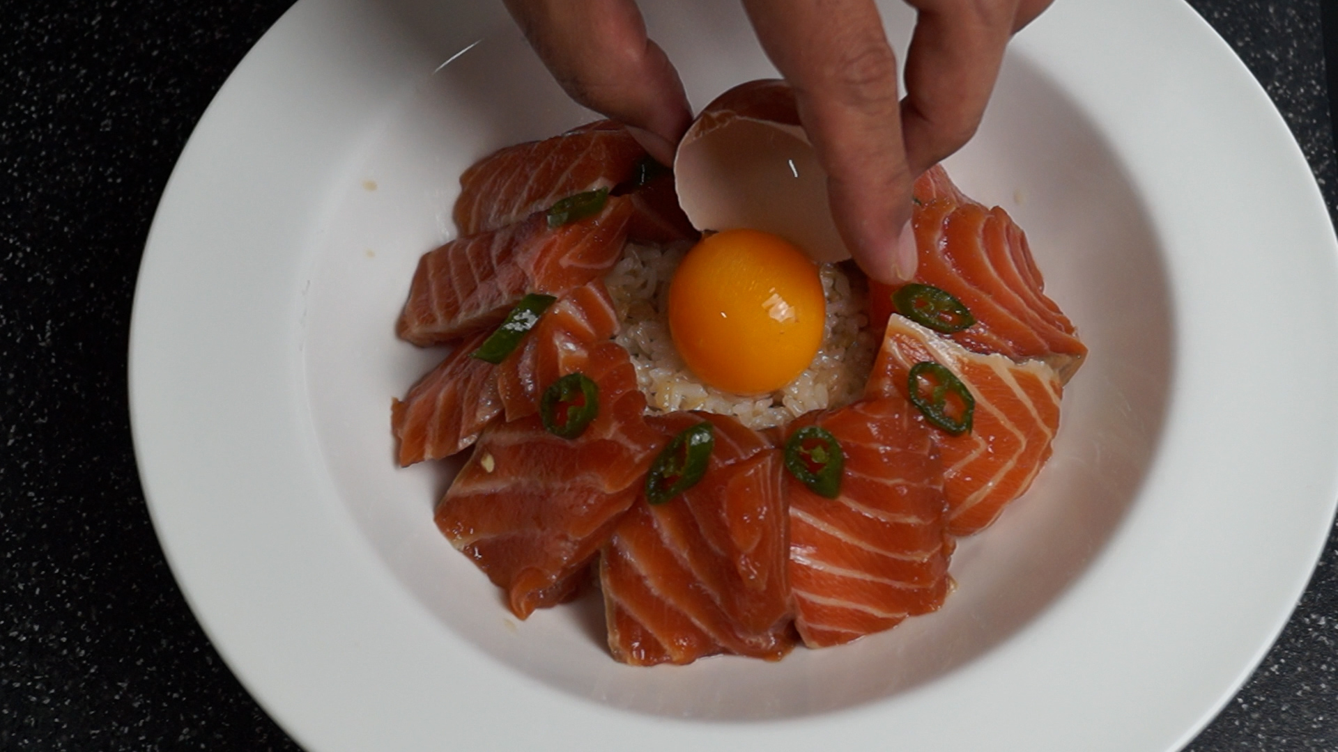 9. 밥위에 연어를 올리고 기호에 따라 연어간장 소스를 뿌리고 노른자를 올려 비벼드세요 정말 맛있습니다.