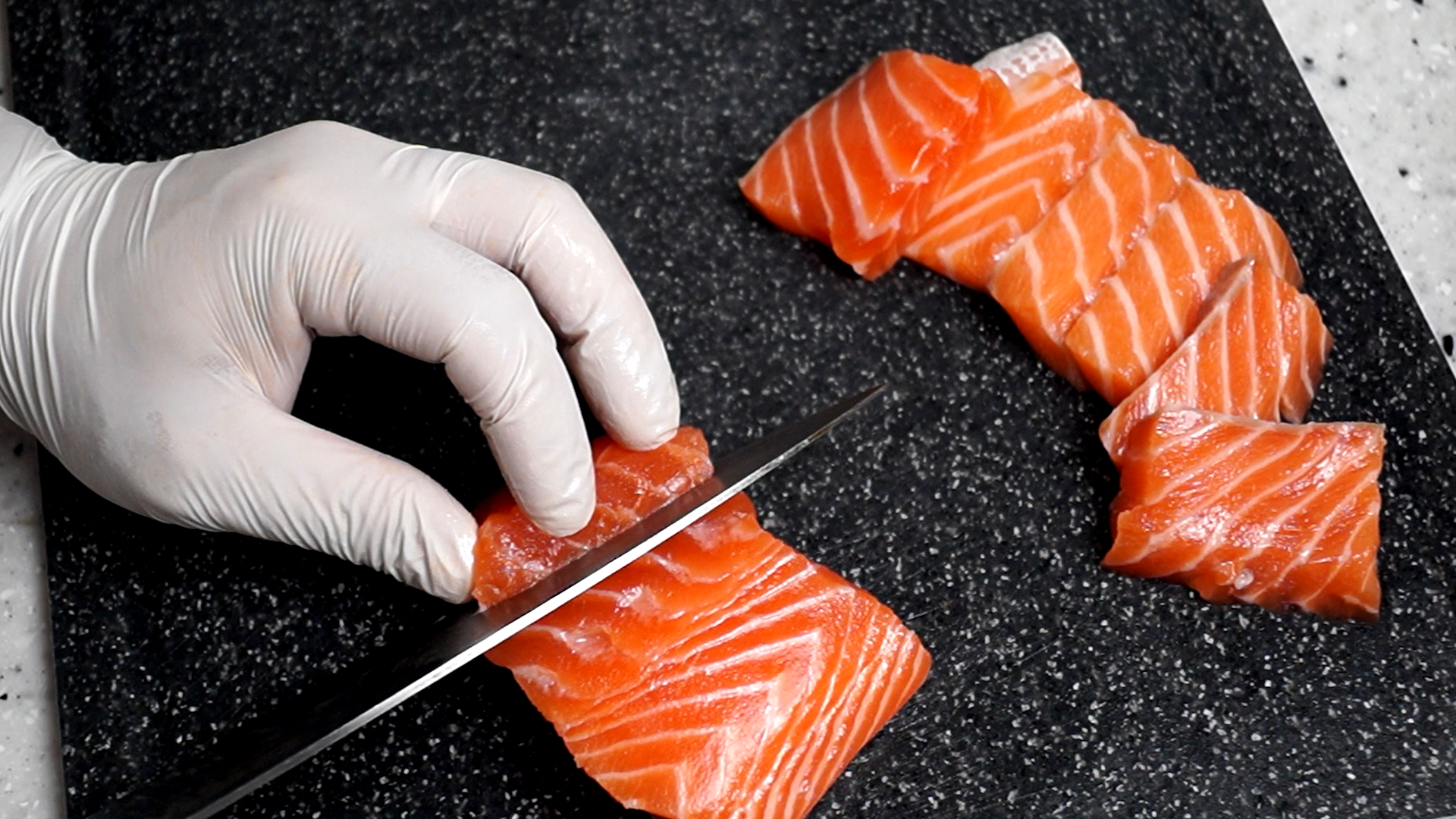 4.연어는 꼭 횟감 연어로 사용하고 1cm 정도 두께로 써세요. 식감을 올리려면 더 두껍게 써셔도 됩니다.