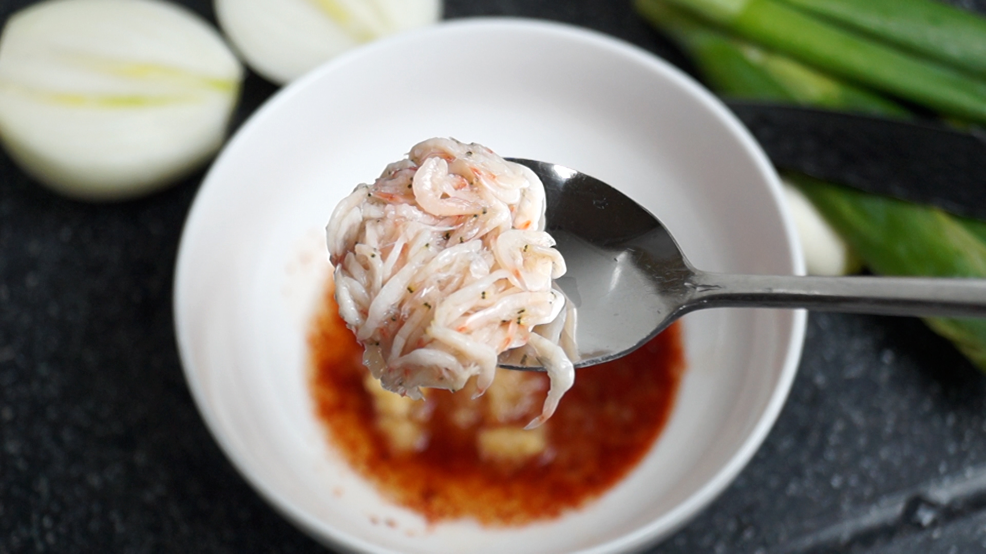 16. 수육 크기 따라 양념 적당히 콕~ 찍어서 새우 1~2마리 끼워서 맛있게 드셔도 좋고 보쌈으로 먹을때도 쌈채소에 고기랑 요고 살짝 찍어올려 쌈장 마늘 고추 무말랭이 조합으로 먹으면 끝내 준답니다.